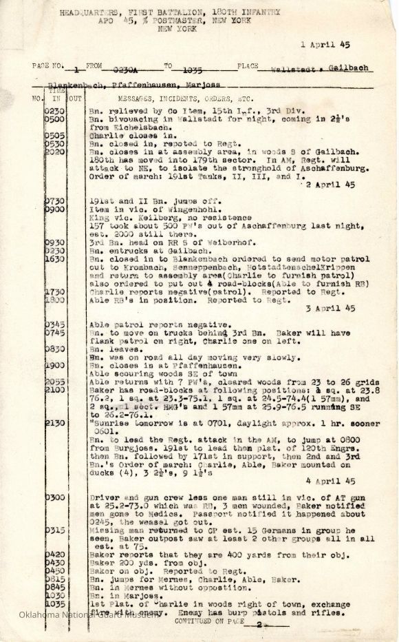 Daily journal of First Battalion 180th Infantry in April 1945. Compiled by Clyde Hoestetler- Battalion Sergeant Major
