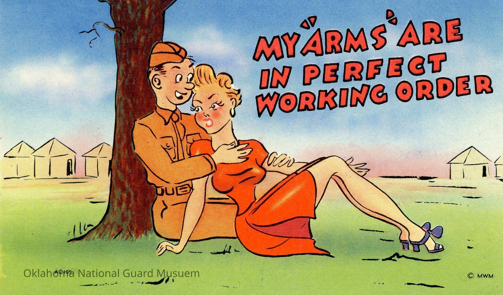 Army Life Cartoon Postcard with a soldier holding a woman. "My "Arms" are in perfect working order" Unused