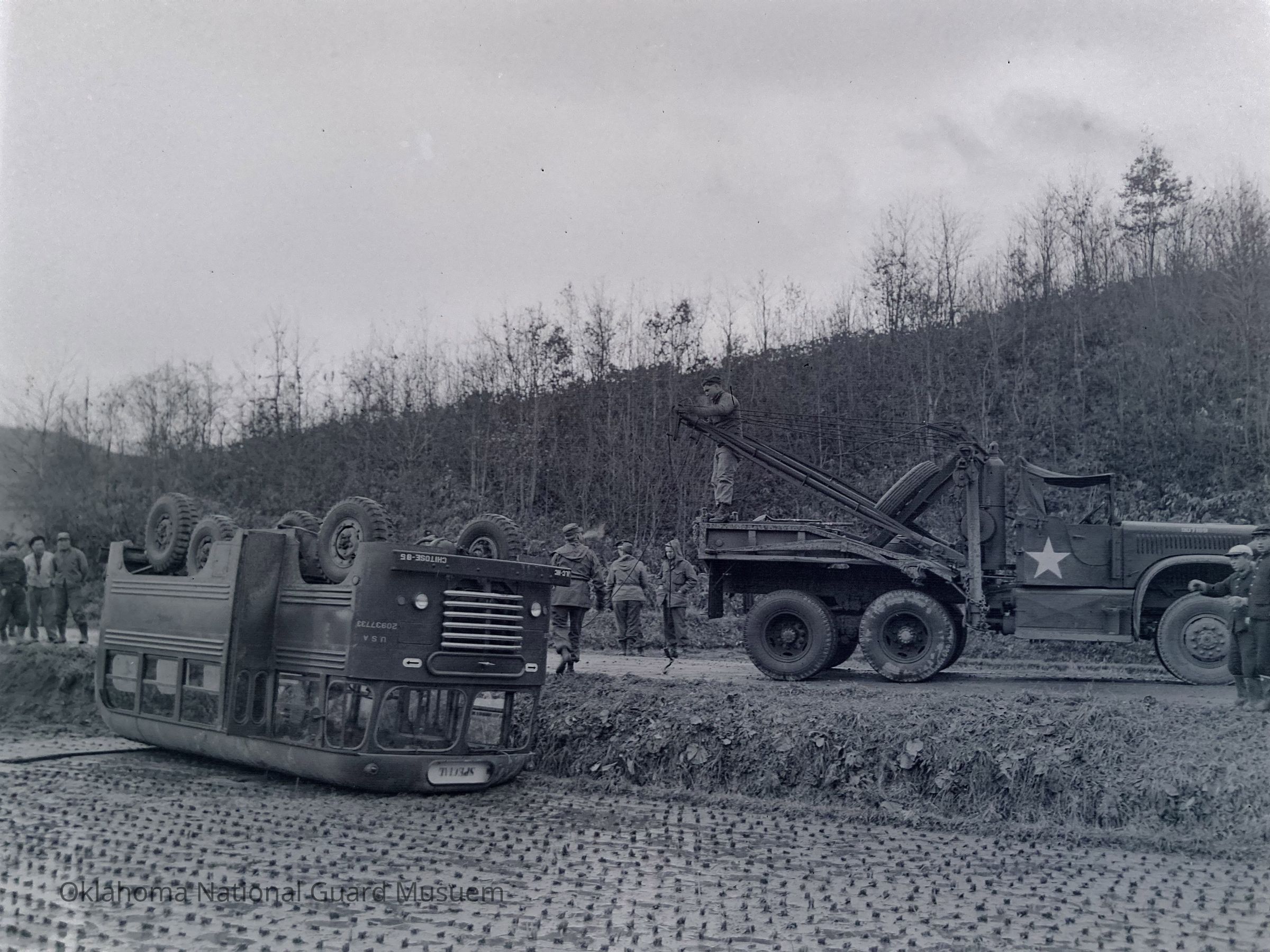 Soldiers, Military vehicles, Transportation, Buses, Tow trucks, Traffic accidents, Wreckers (Vehicles)