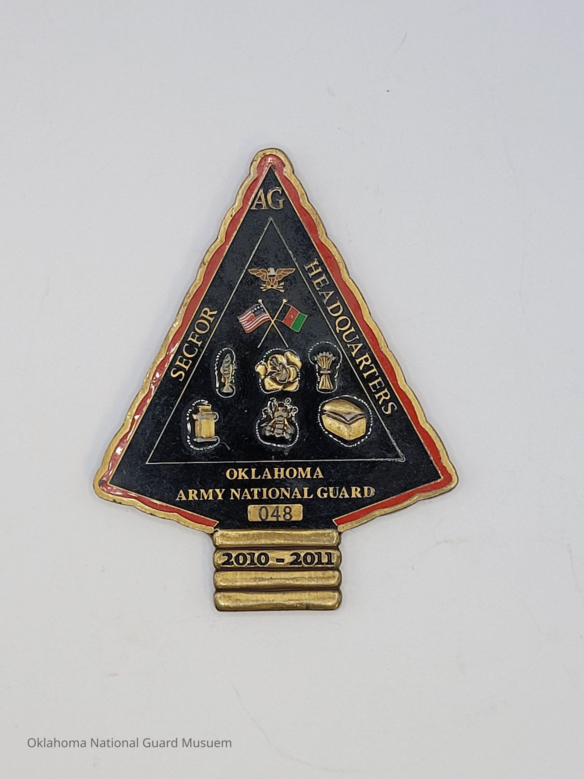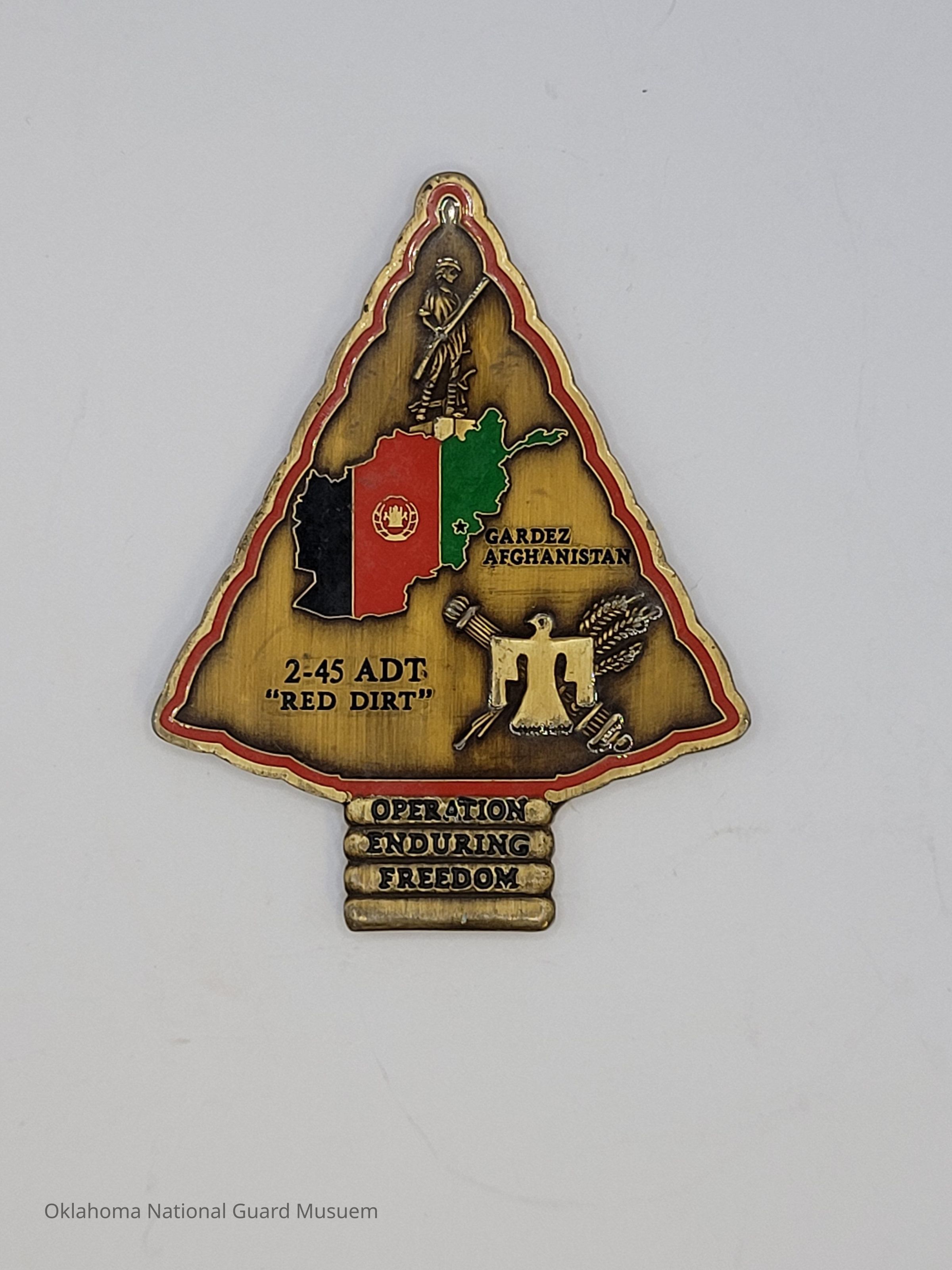 Arrowhead challenge coin for 2-45th Agricultural Development Team 2010-2011 deployment to Afghanistan. One side of the coin features the American and Afghan flag with agricultural symbols in center. "Sector Headquarters" along the edge. The reverse of the coin features a map of Afghanistan, a minuteman, and a Thunderbird in front of crossed wheat ears.