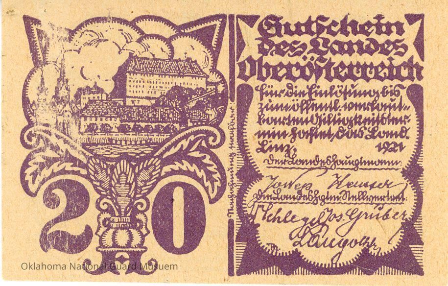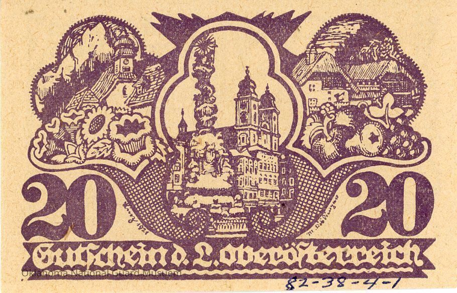 Austrian Notgeld Twenty Heller. Dated 1921. Accession number written on reverse at the bottom. Issued by the State of Upper Austria