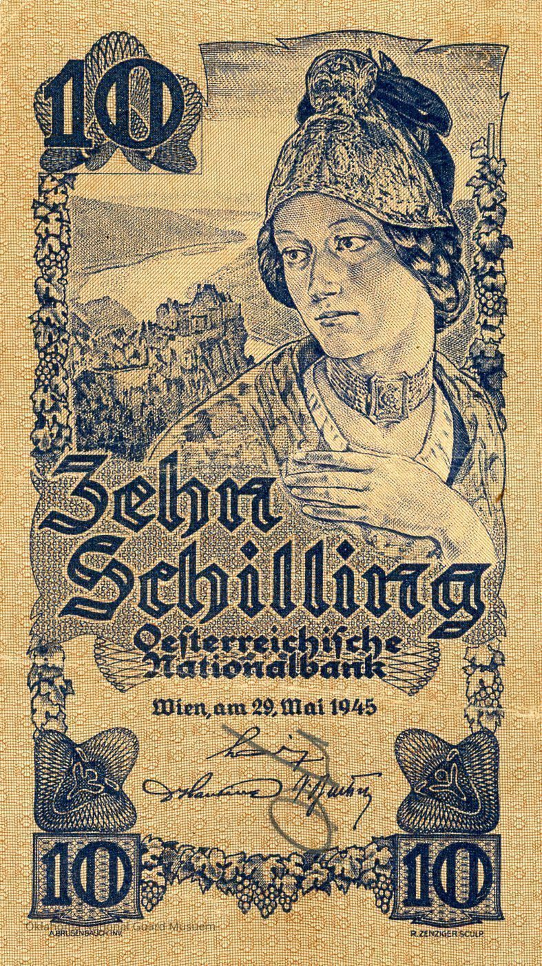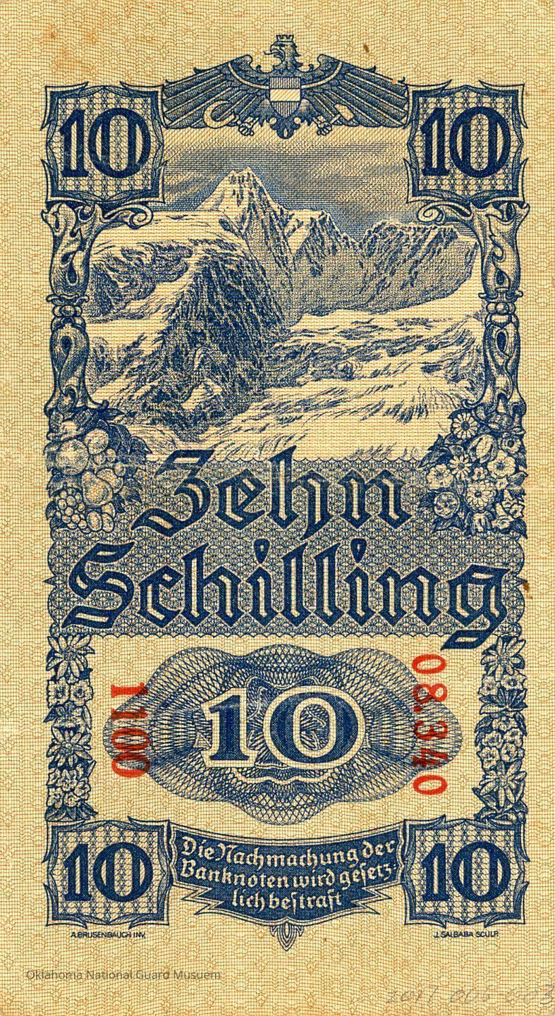 Austrian Ten Schilling- First Issue. Dated May 29, 1945. Accession number written on reverse at bottom.