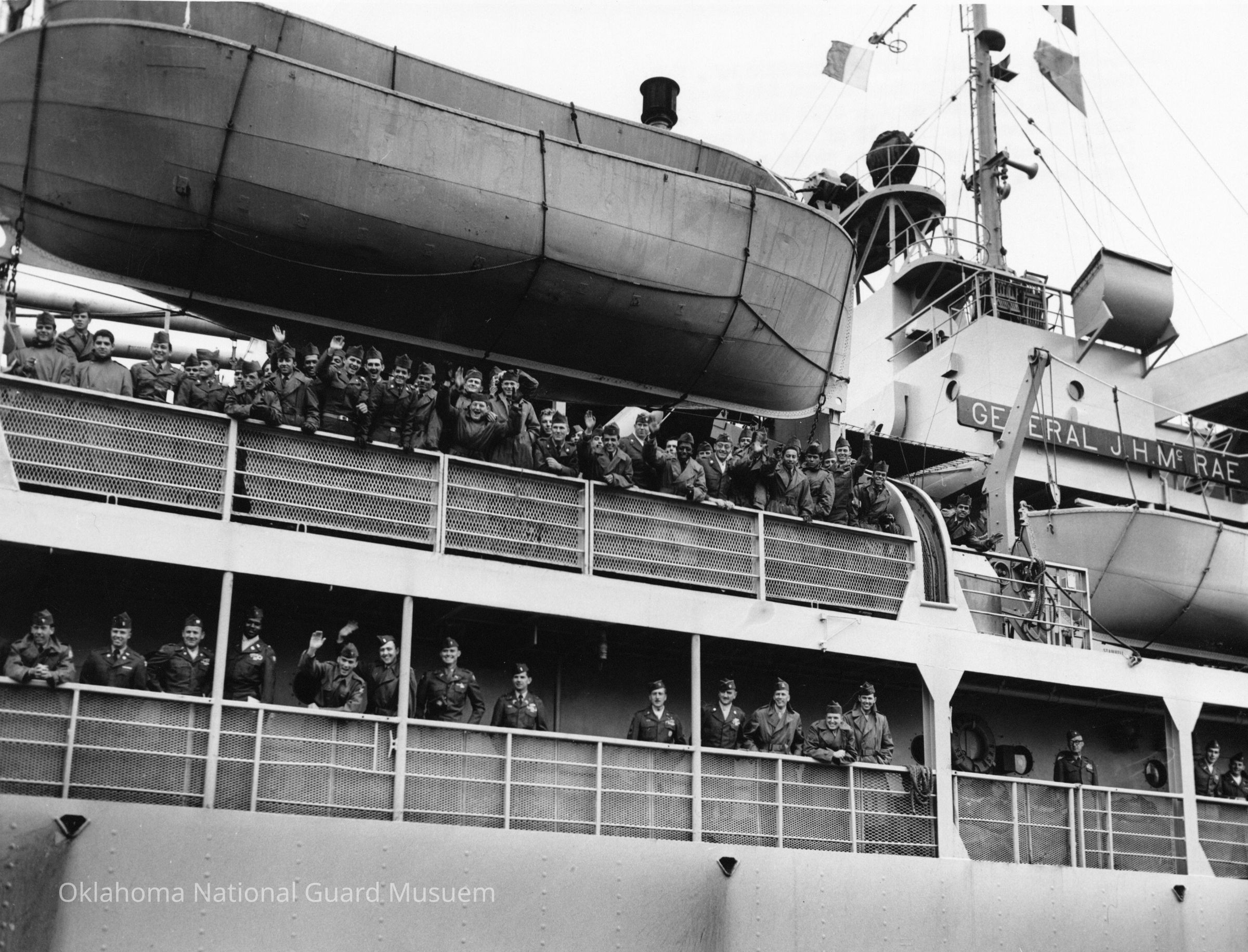 45th soldiers waving from the deck of the USNS General J.H. McRae in New York harbor Pier 10 after their return from Korea