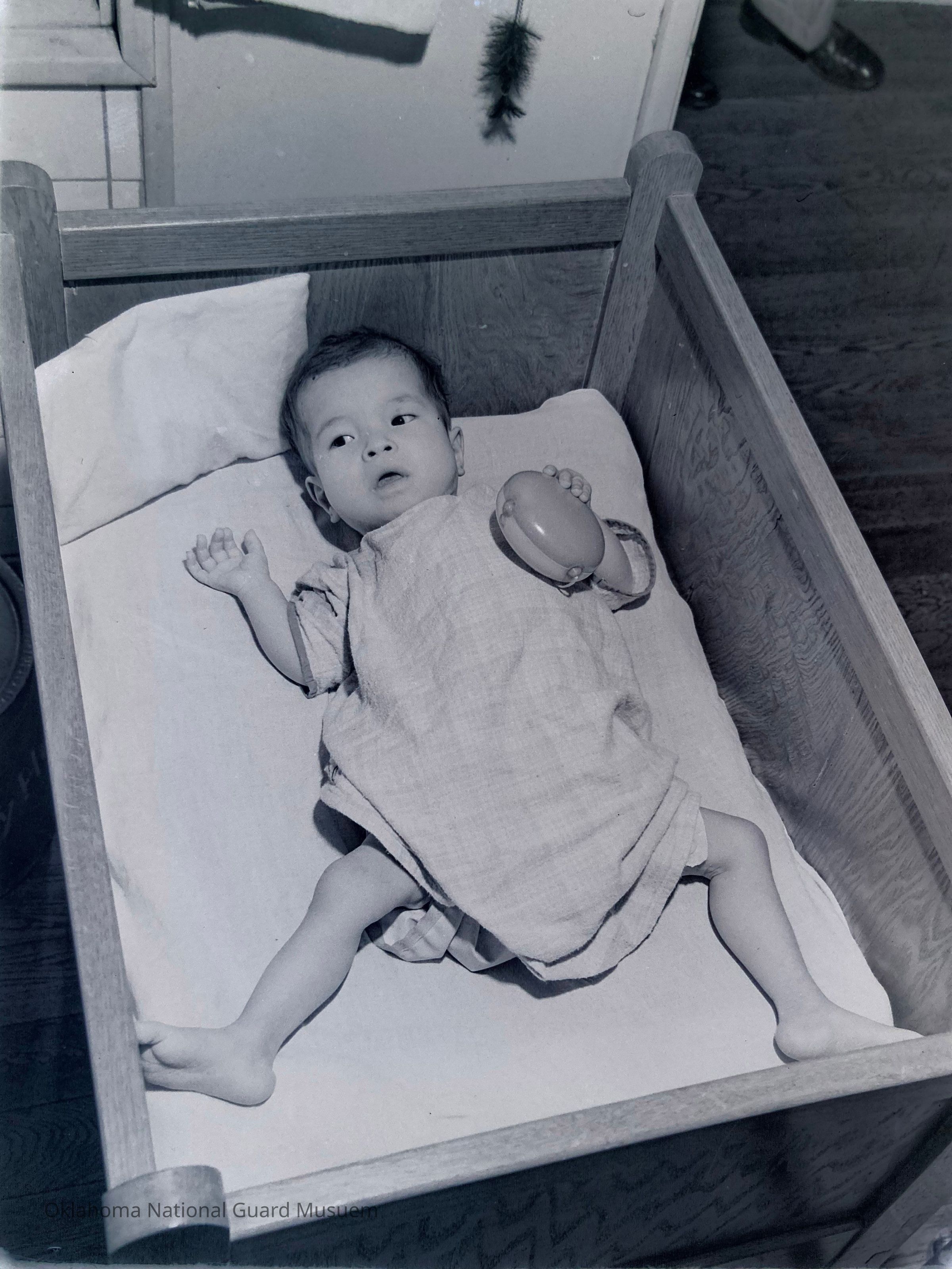Negative of a baby in a crib on Hokkaido, Japan