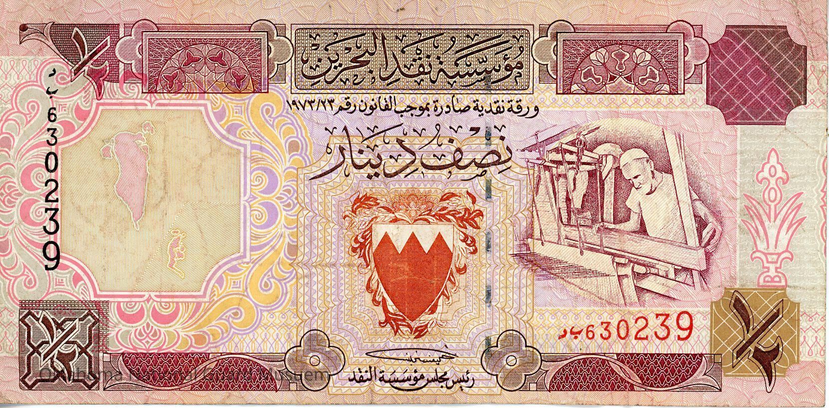 Background made up of arabesques and guilloche patterns. Texts in Arabic. Prefix and horizontal and vertical numbering in black and red. Map on the left. The Bahraini coat of arms shield in the center is in red. Blind weaver of the Bani Jamra Village Handicraft Center. “١/٢” value in the angles.