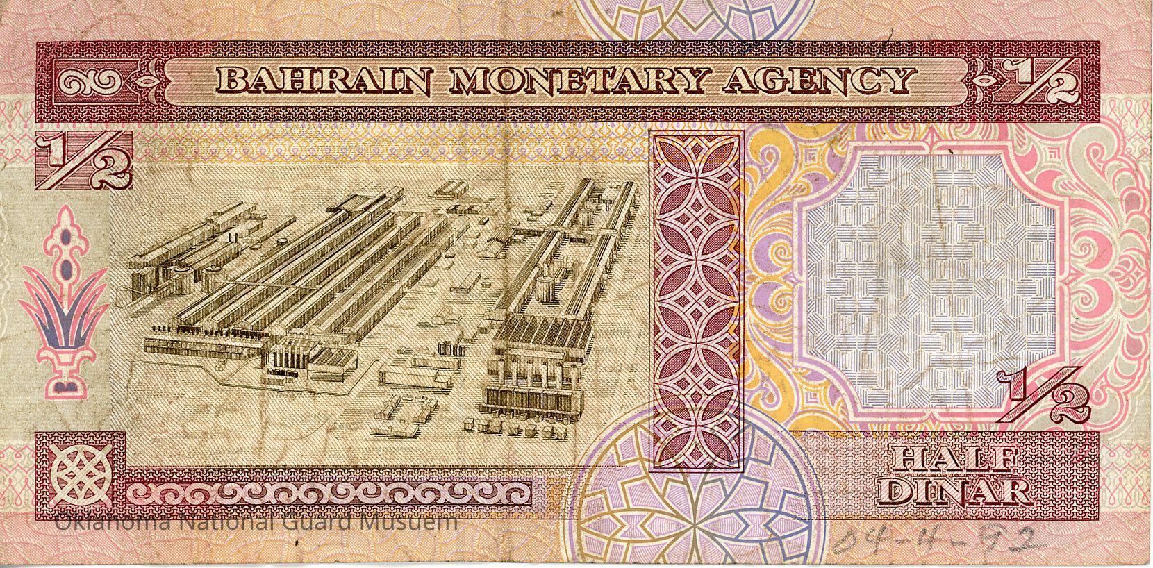 Bahrain One-Half Dinar Type 1973. Issued 1993. English on reverse with Arabic on Obverse. Accession number written on reverse at the bottom.