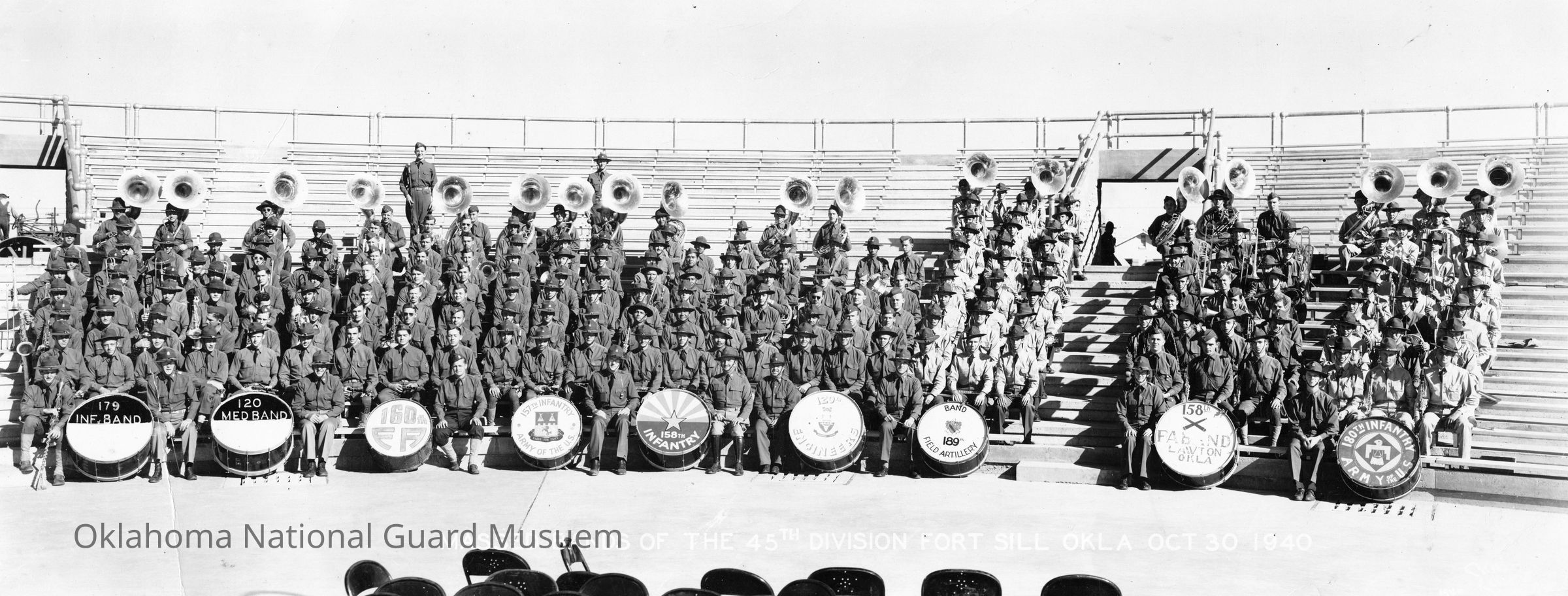Massed bands of the 45th Division with their distinctive bass drum designs. 179th Infantry Band, 120th Medical band, 160th Field Artillery Band. 157th Infantry Band, 158th Infantry Band, 120th Engineers Band, 189th Field Artillery Band, 158th Field Artillery Band, 180th Infantry BandPhotograph Details