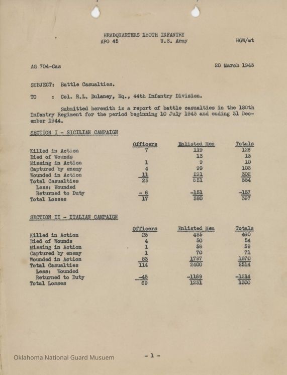 Battle casualties for the 180th Infantry from July 1943 through Dec 1944