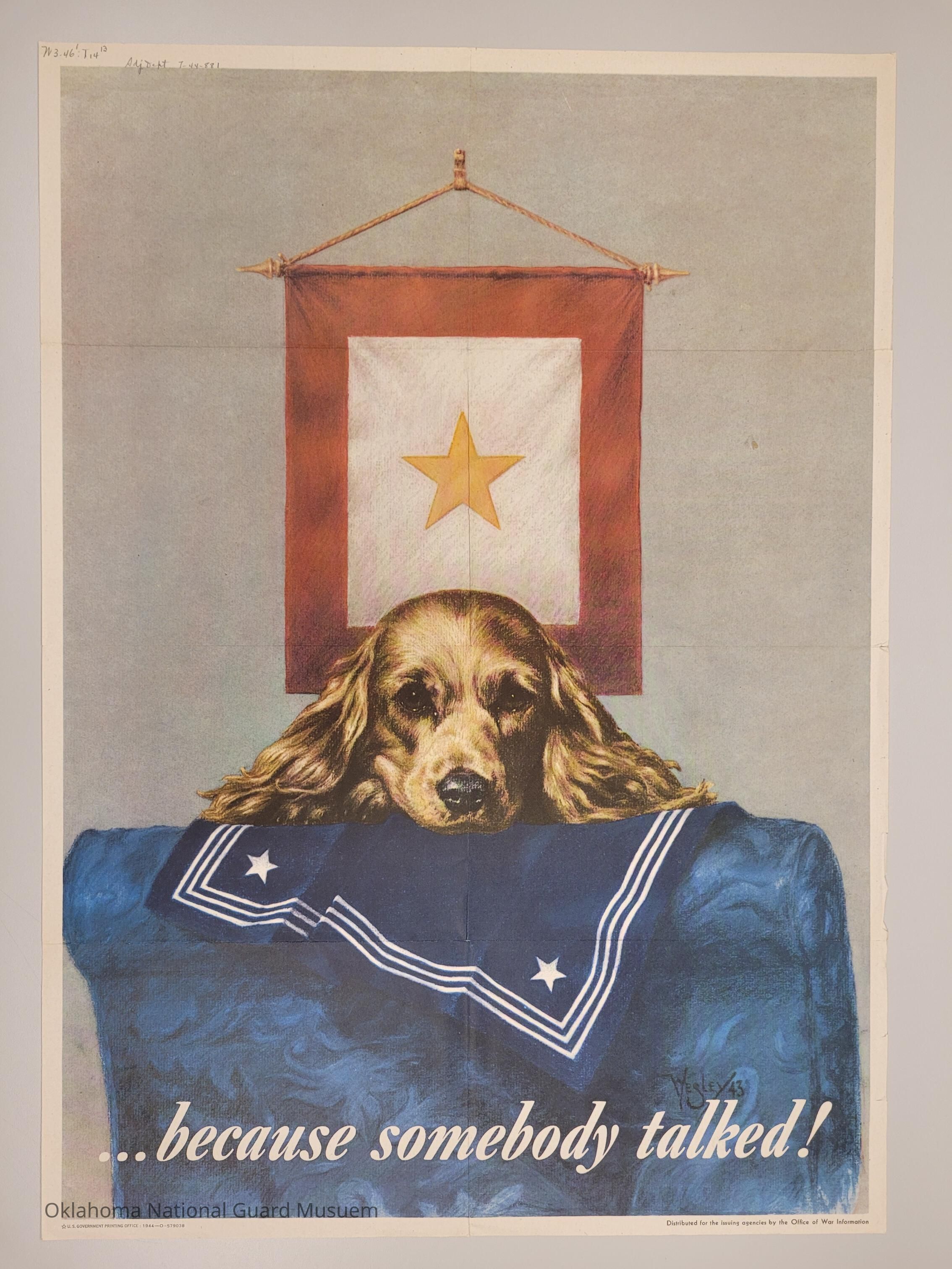 Color poster shows a sad cocker spaniel with its head resting on sailor's collar on back of a blue chair. On the wall behind the chair hangs a "Gold Star" service flag with a red border, white center and yellow star in the middle. A gold star on a service flag signifies a family member who has died in war.Collection