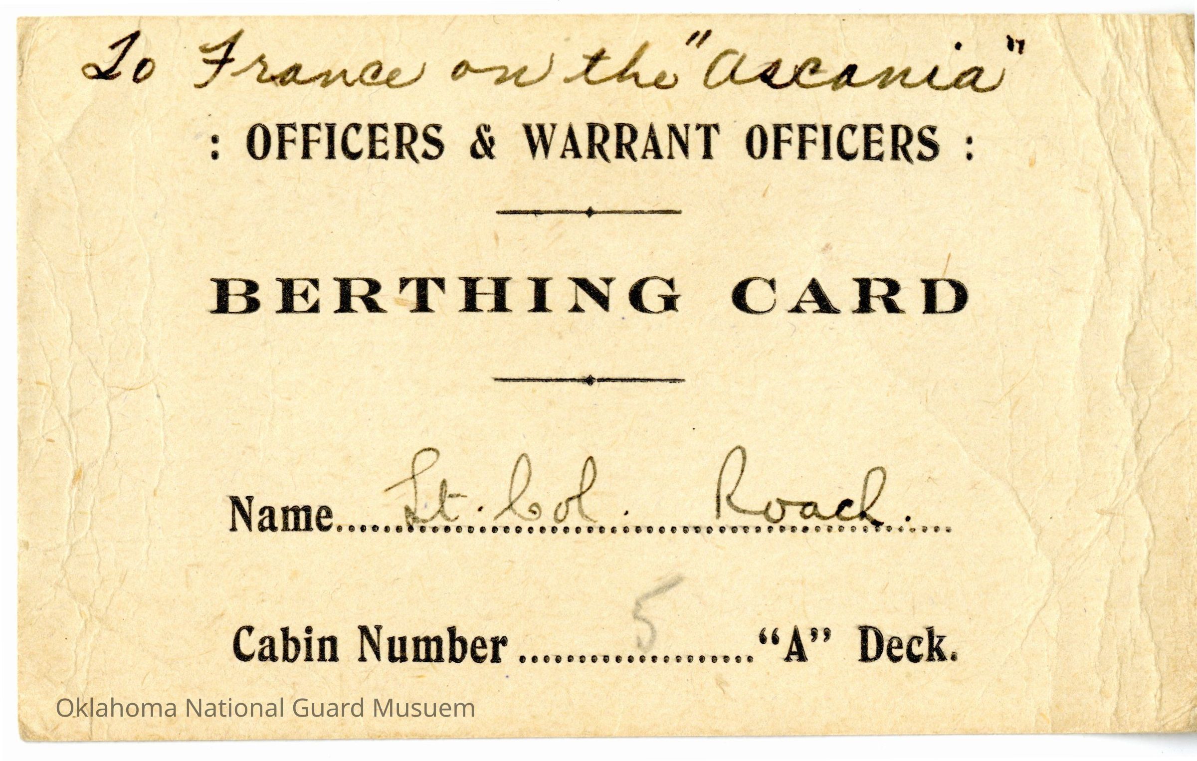 Berthing Card for Henry B Roach (45th Division Adjutant) before the invasion of Southern France on the ship "Ascania"Context