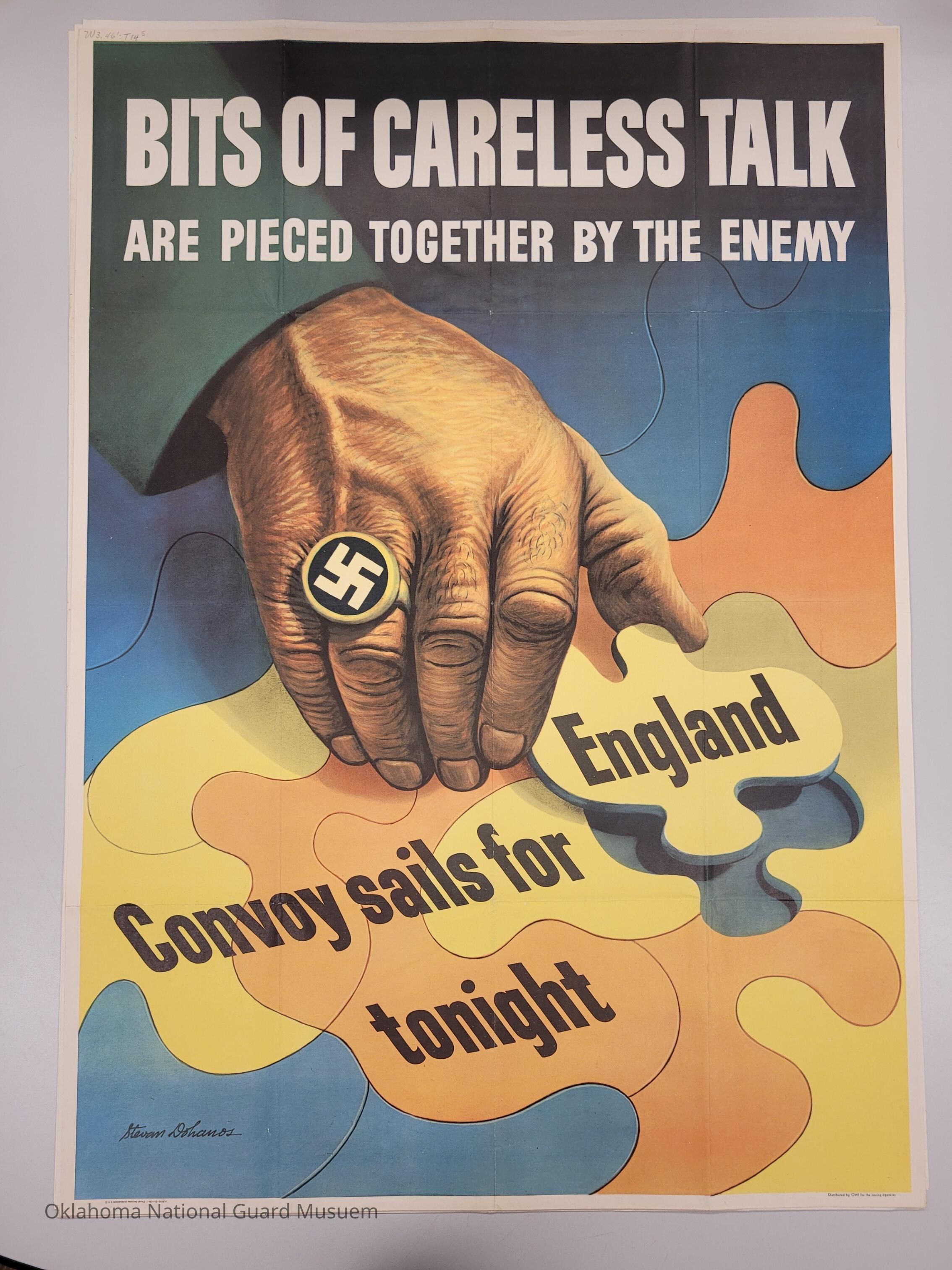 Second World War poster depicting a hand wearing a Nazi ring piecing together a jigsaw puzzle. The last piece of the jigsaw is being placed, completing the message "Convoy sails for England / tonight". The poster aims at telling its audience that they should be careful about what they say that can be overheard, as small pieces of information can be put together to form potentially sensitive informationCollection