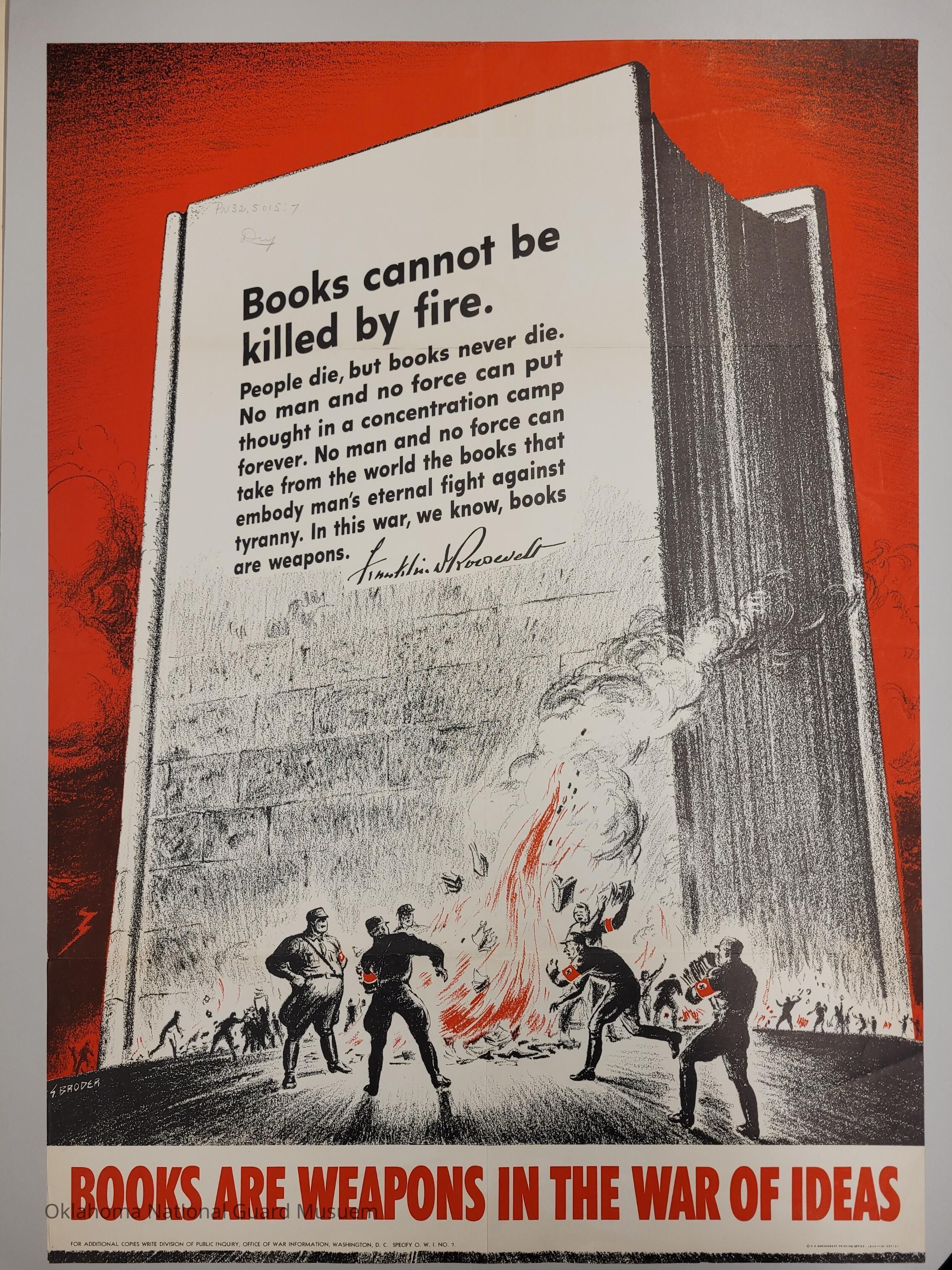 Color poster by S. (Steve) Broder depicting soldiers wearing Nazi armbands burning books in front of a monumental book on which cover Franklin D. Roosevelt is quoted: "Books cannot be killed by fire....", emphasizing the poster's message, "Books are weapons in the war of ideas."Collection