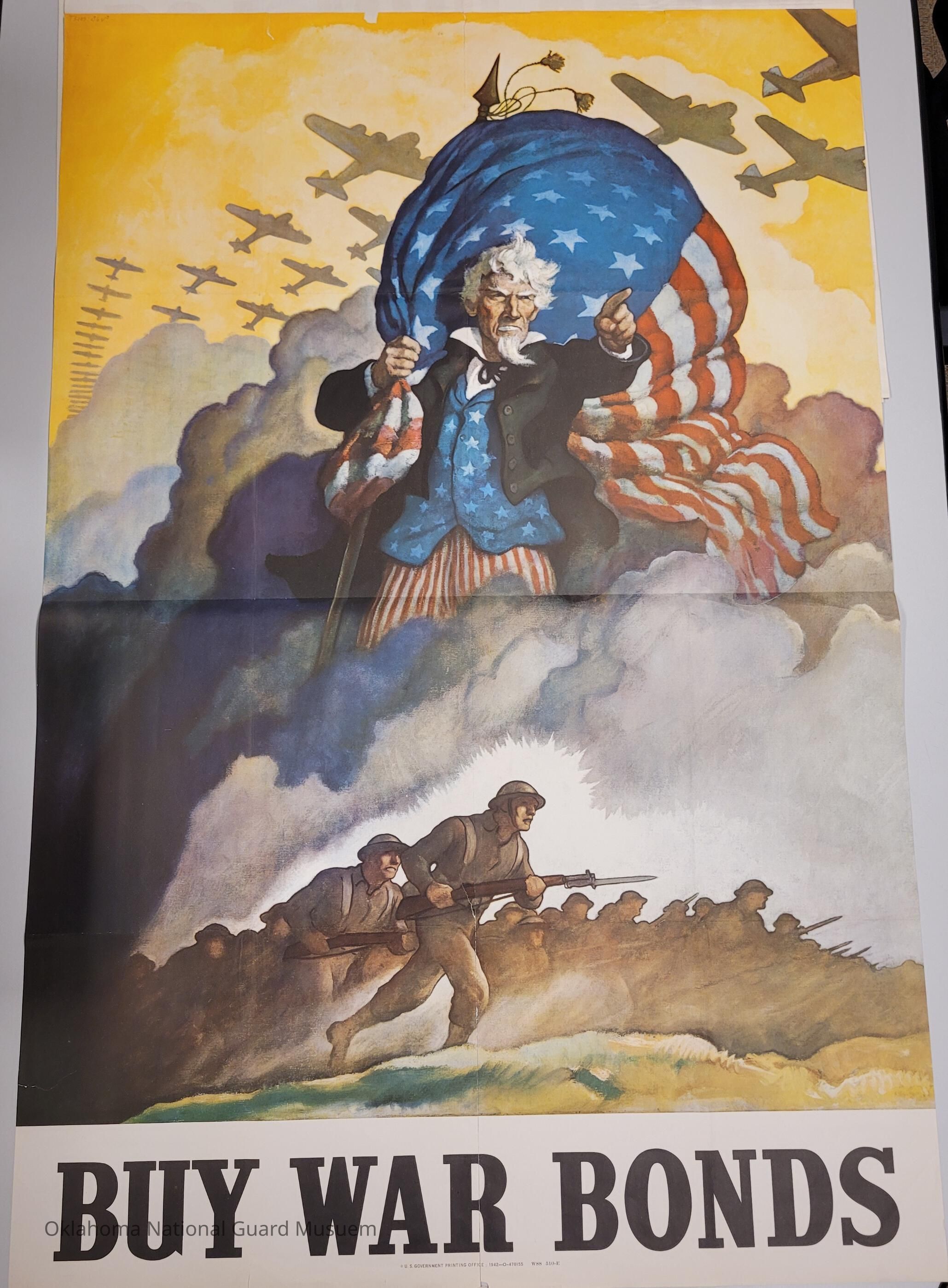 Uncle Sam pointing forward on clouds while holding a flag. Planes fly overhead while soldiers fight below