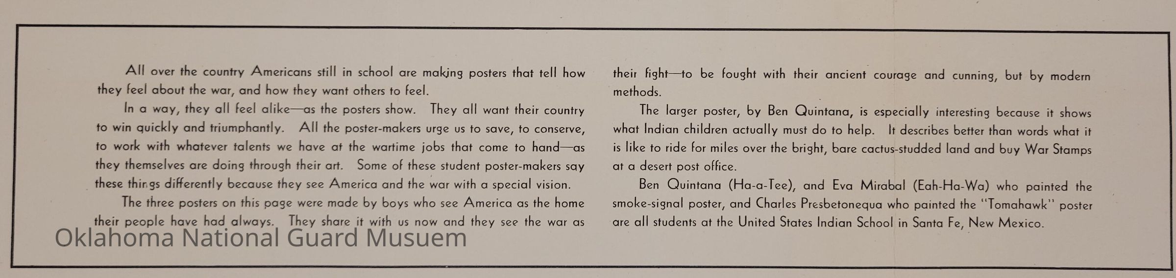 Three images on one print, each image shows Native Americans supporting the war effort. Posters made by students in the United States Indian School located in Santa Fe, New Mexico. The top left poster shows a native man sending up a smoke signal. The upper right shows a native warrior with fighter planes, the bottom shows three native children bringing their savings to the post office.Collection
