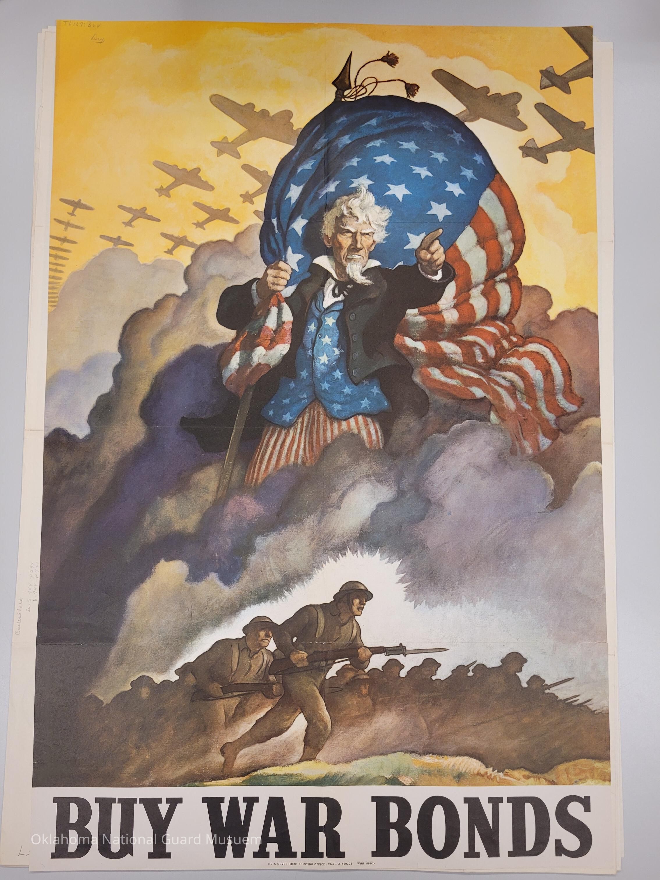 Uncle Sam pointing forward on clouds while holding a flag. Planes fly overhead while soldiers fight below