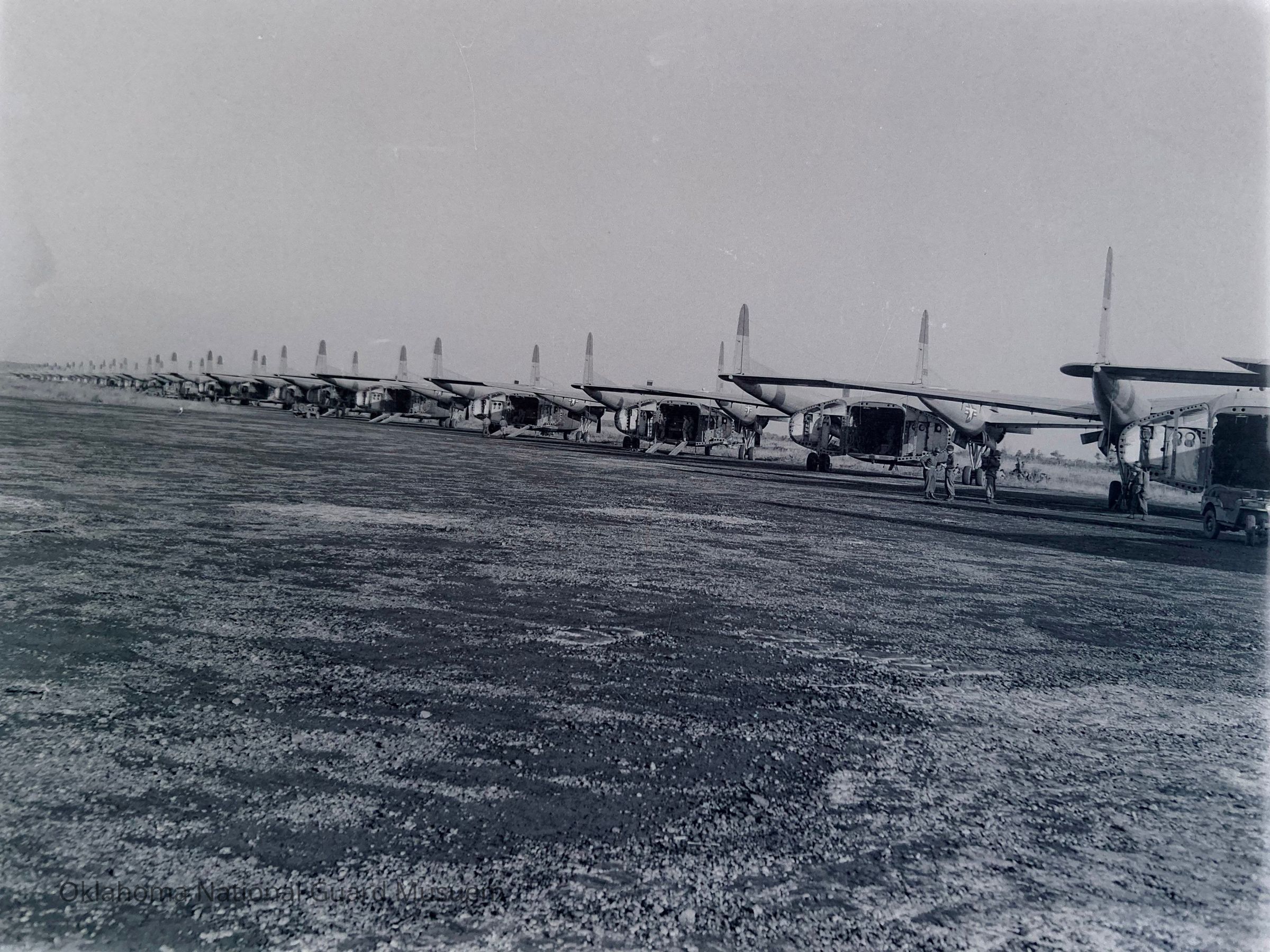 Negative of C-119 cargo planes awaiting loading on Hokkaido, Japan