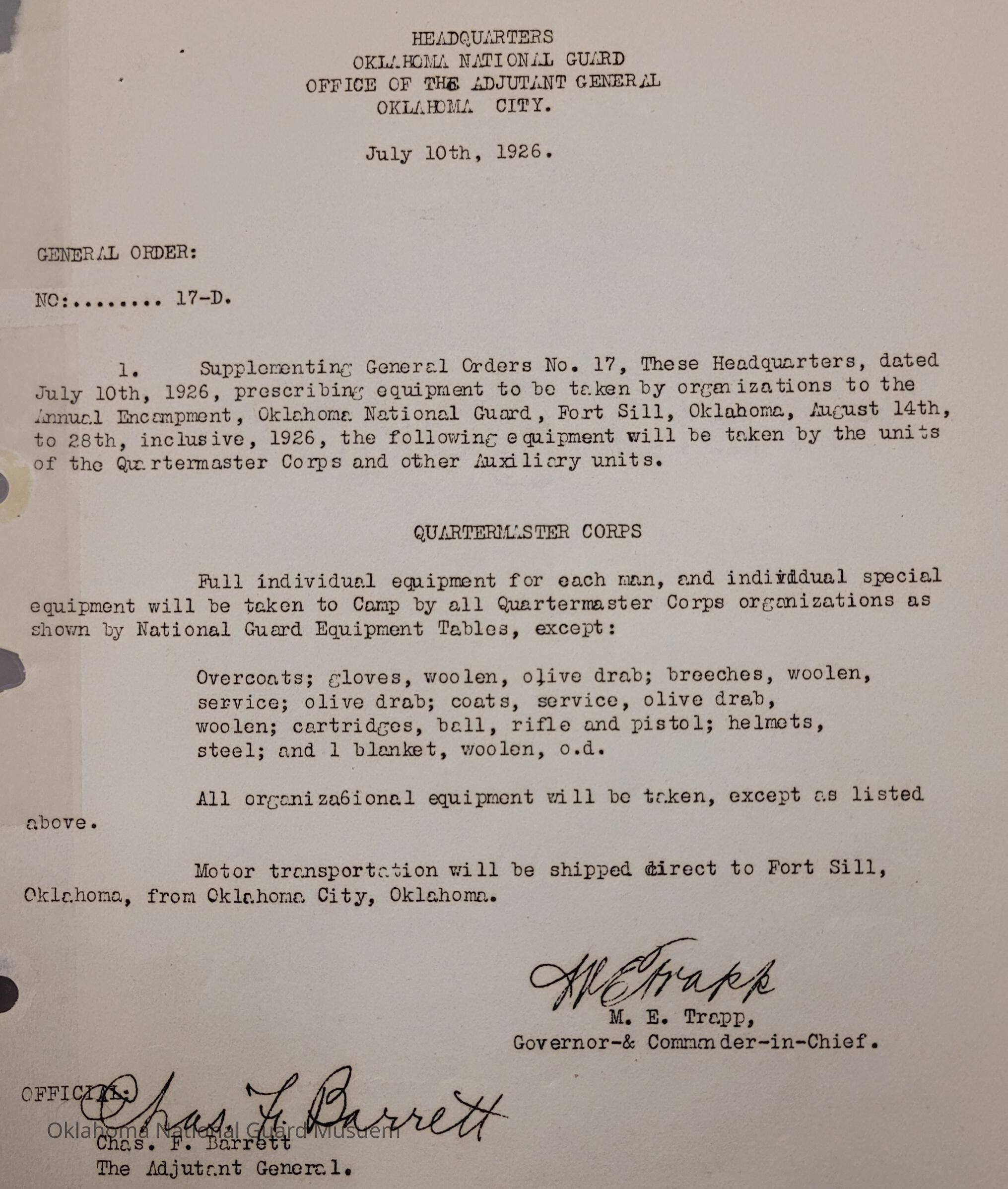 General Order #17-D from Headquarters Adjutant General's Office in Oklahoma City. The order supplements General Order 17 and details what equipment, particular to the Quartermaster Corps and other Auxiliary Units, should be taken to the annual encampmentDate(s) of Creation