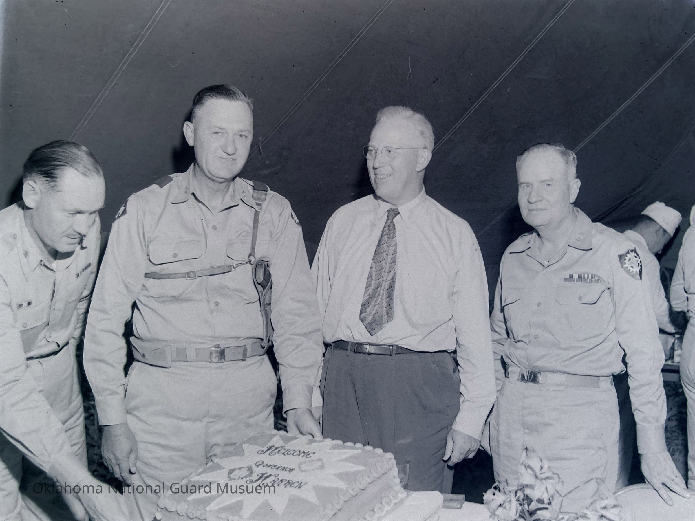 Negative of California Govenor Earl Warren at a welcoming ceremony with General Styron (center) and General Roderick Allen (far right) General Homer Eaton (far left) on Hokkaido, Japan