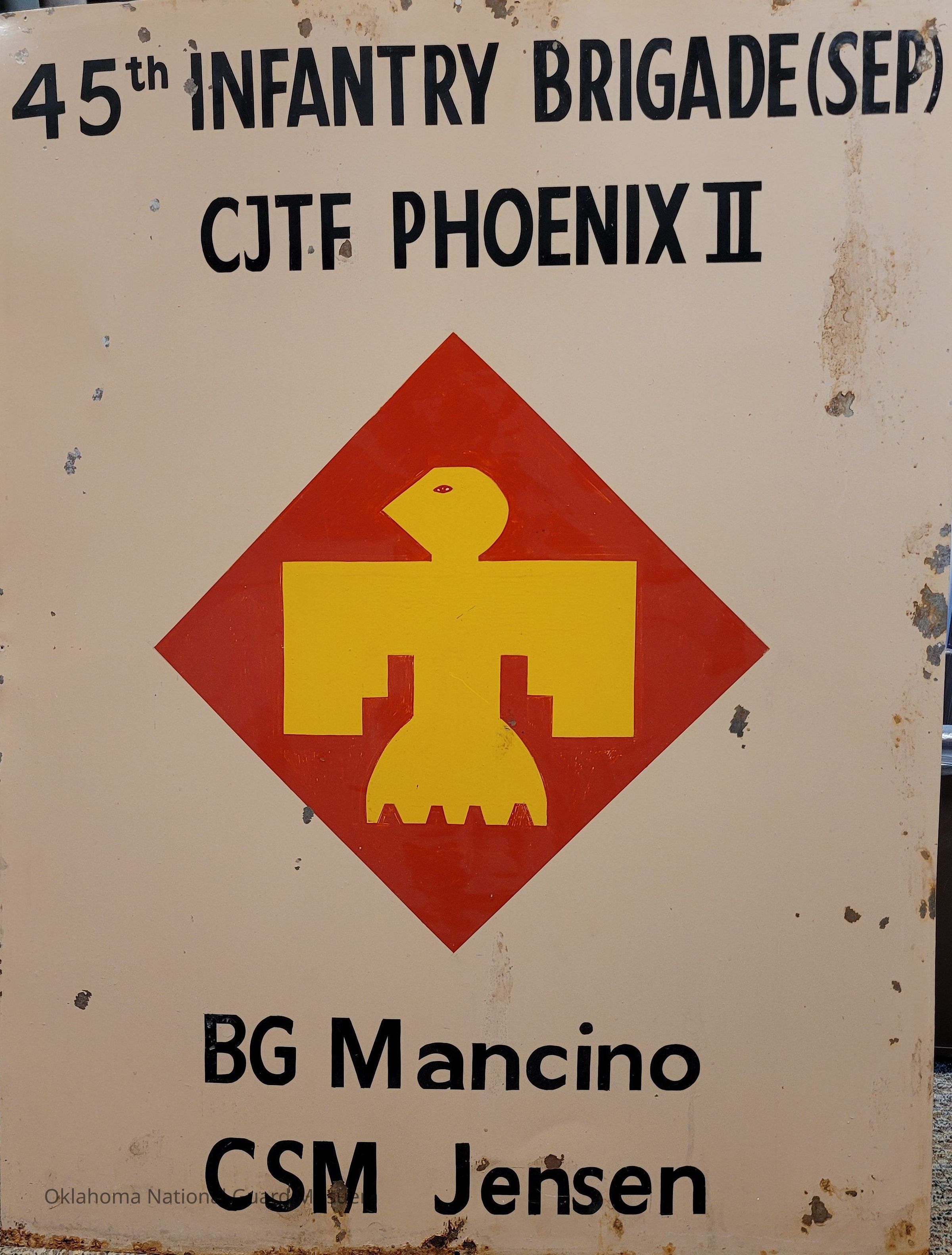 Camp Phoenix II sign. Painted thunderbird in the center. General Thomas Mancino and Command Sergeant Major Jensen painted on the bottom.
