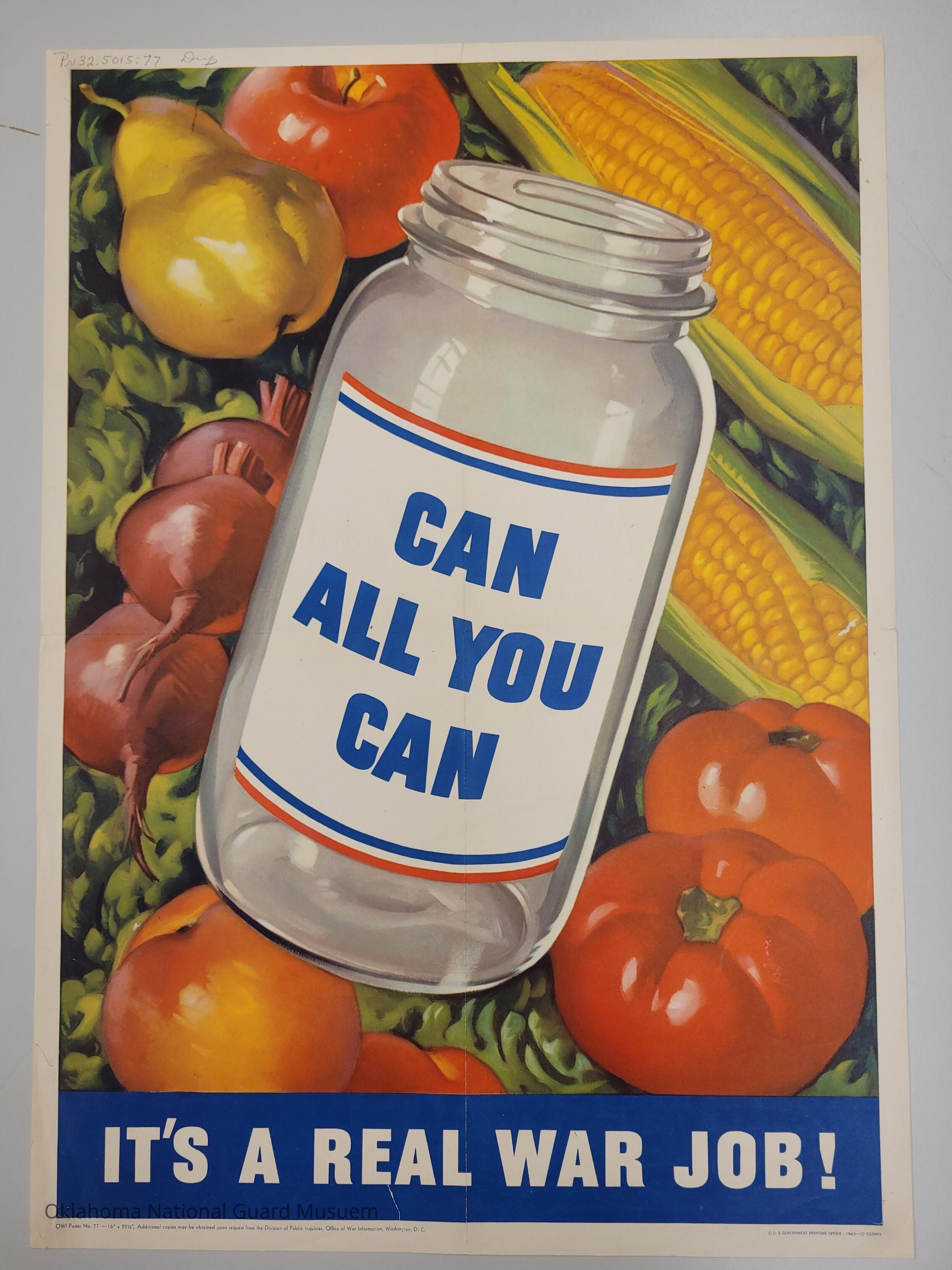 This colorful World War II era poster encourages the American homefront to support the war effort. It features a glass jar with a label on it that reads "Can All You Can" in front of a background of fruits and vegetables.Context