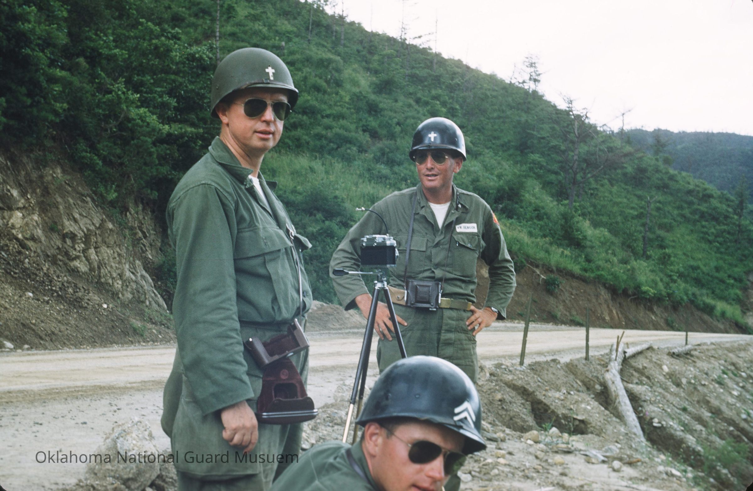 Chaplains setting up a camera on the side of the road. Chaplain Curtis on the far left