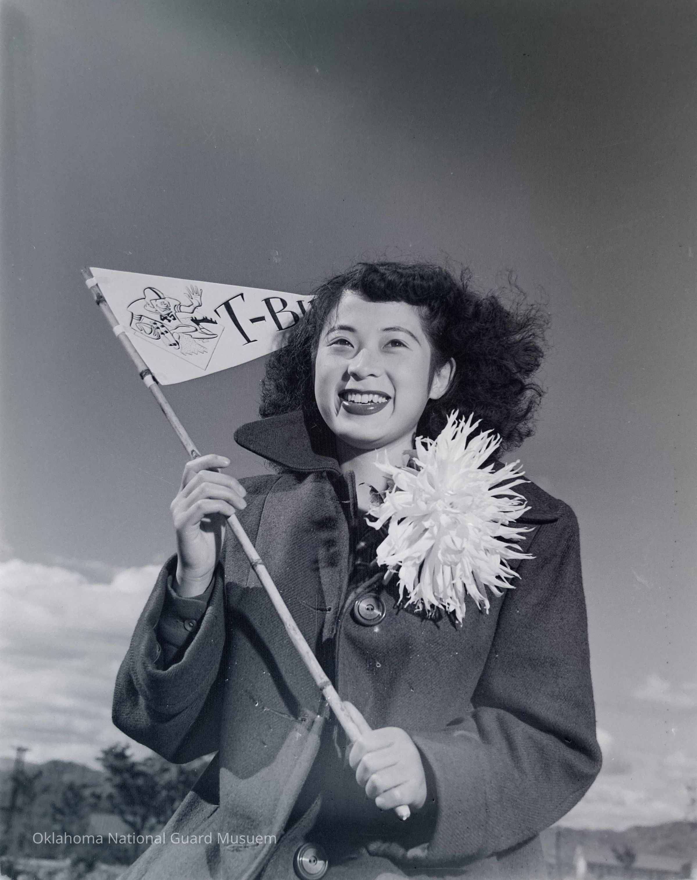 Published in the 45th Division News, Hokkaido, Japan, October 4, 1951 "Yep, this little gal was there Saturday at the Thunderbird-GHQ football game. This picture by Ron Pryer, has been entered int "Sport" magazine's Football Queen of the Month Contest. She's Cherry Reiko, who works in Camp Crawford."Made/Created