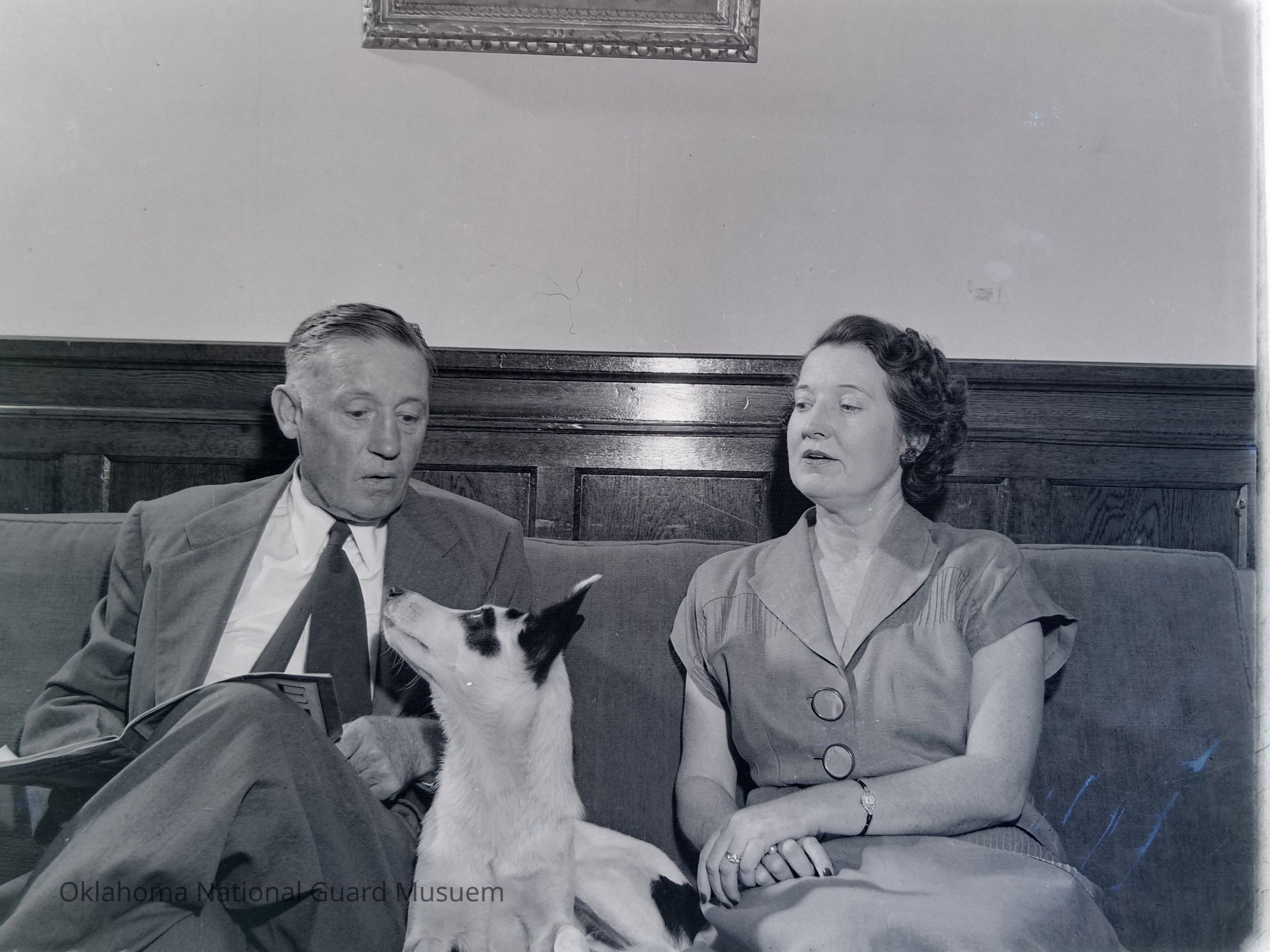 Negative of civilian couple seated on couch with a dog on Hokkaido, Japan