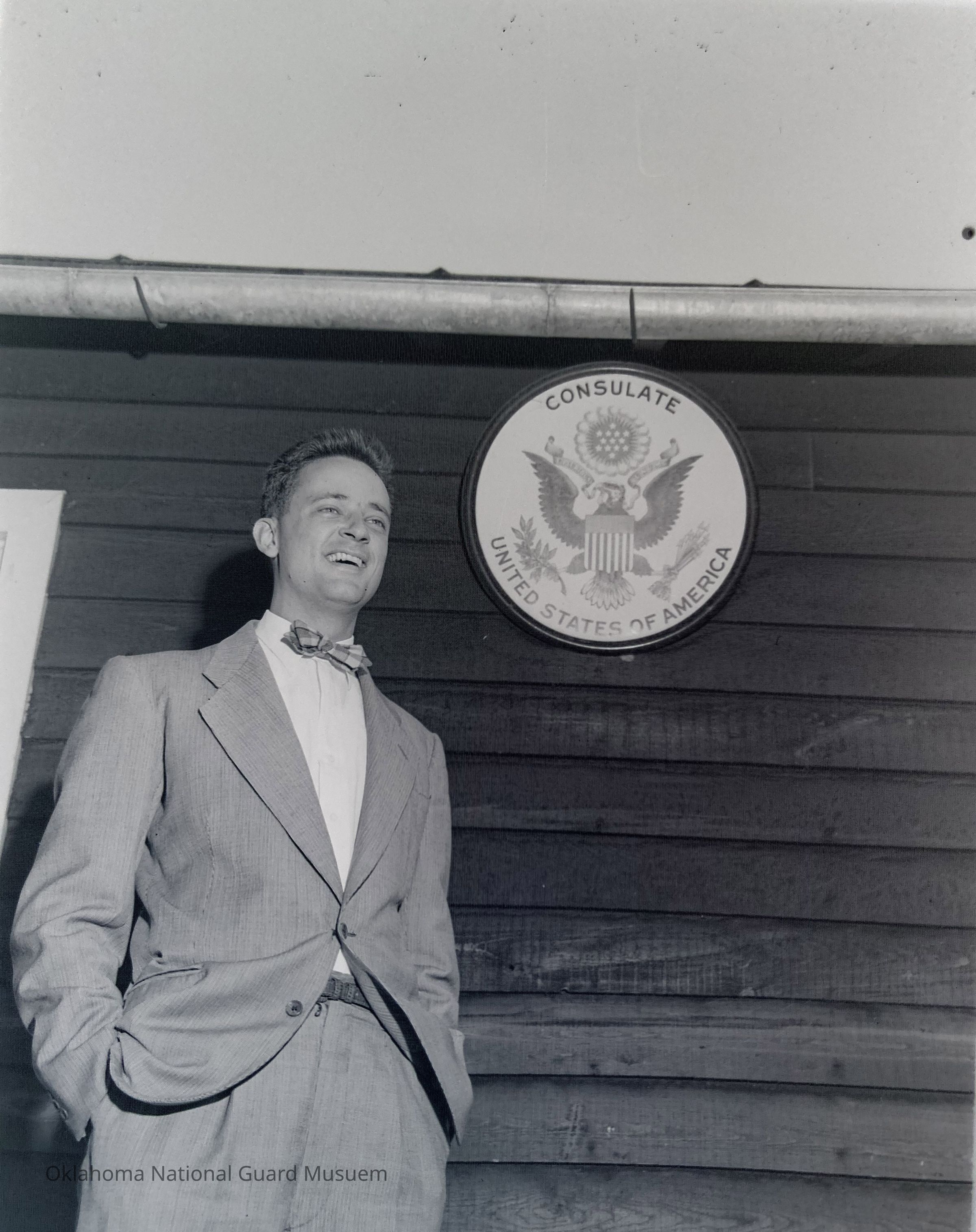 Negative of civilian standing in front of a US Consular Seal on Hokkaido, Japan