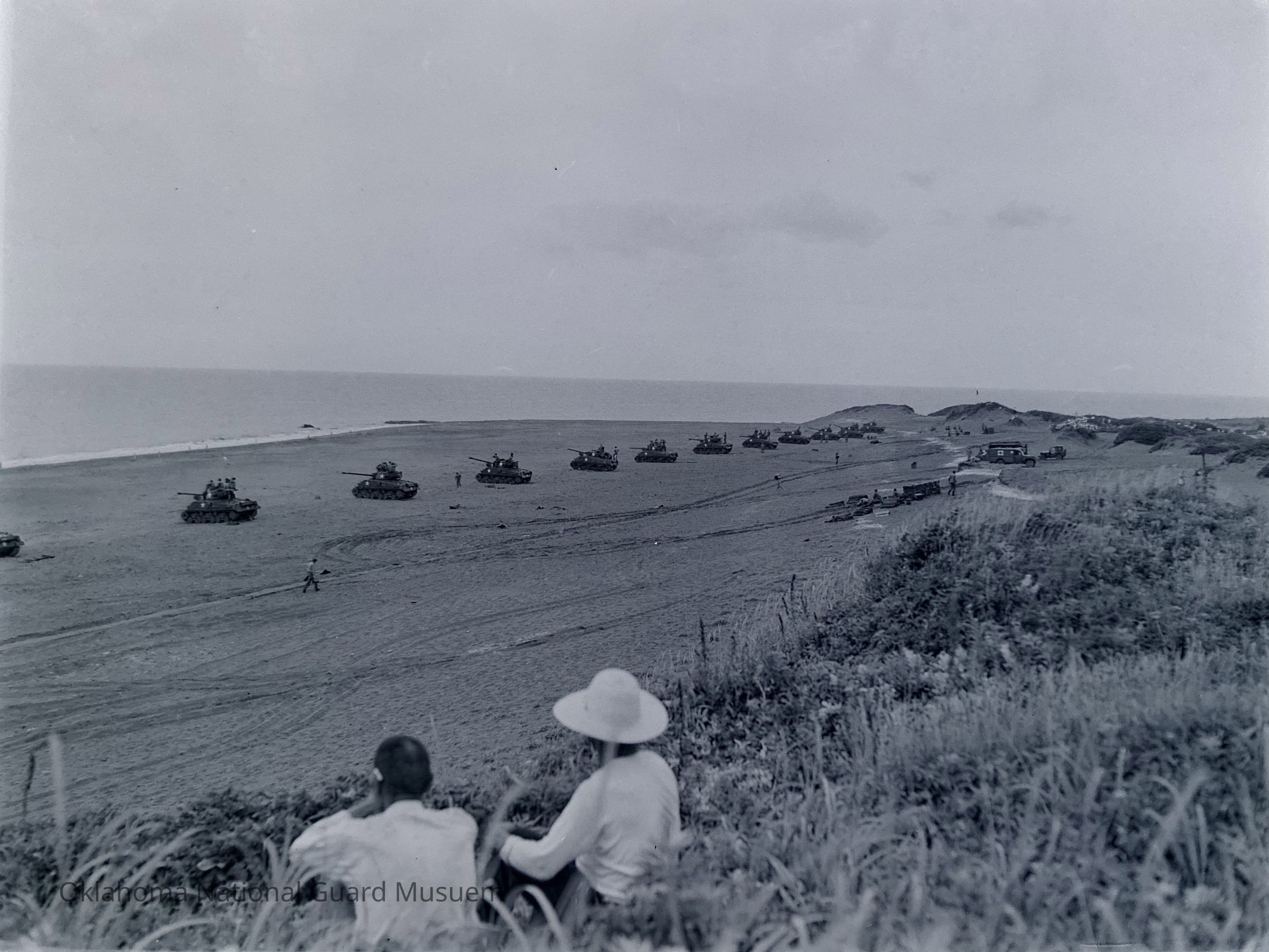 Negative of civilians observing a line of tanks practice-firing out to sea on Hokkaido, Japan
