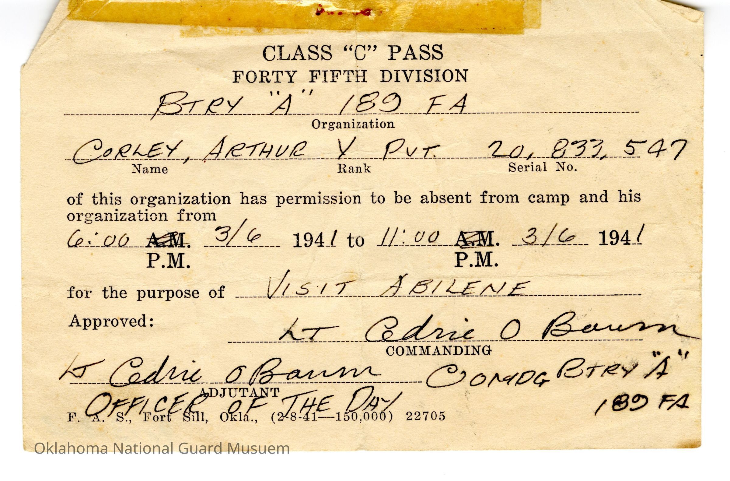 Class "C" pass for Arthur V. Corley, 189th Field Artillery, to leave Camp Barkeley on the evening of March 6, 1941 to visit Abilene