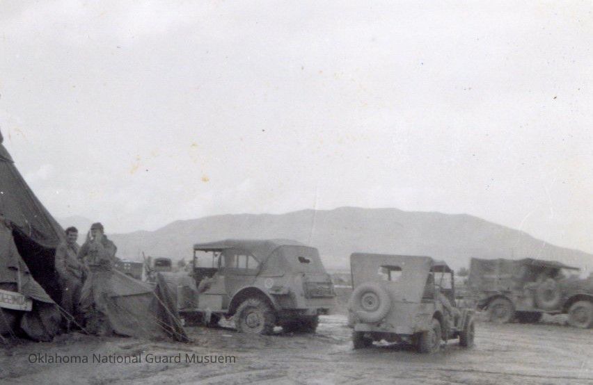 Clearing Station 45th Division. Soldiers stand in front of tent opening next to three jeeps