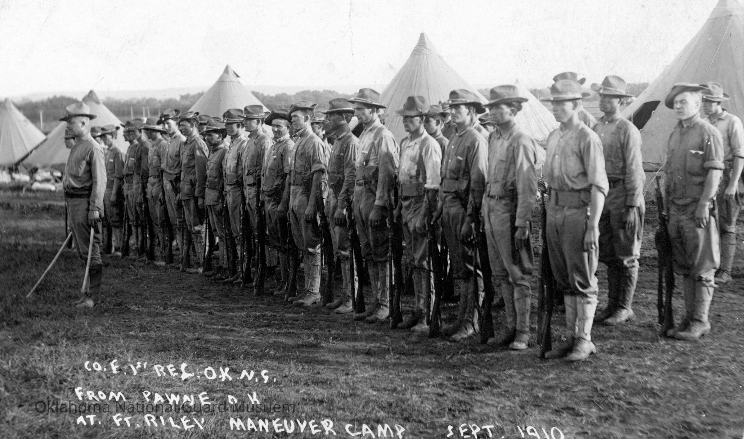 Company F First Regiment of the Oklahoma National Guard stands at attention in front of tents at Fort Riley, Kansas