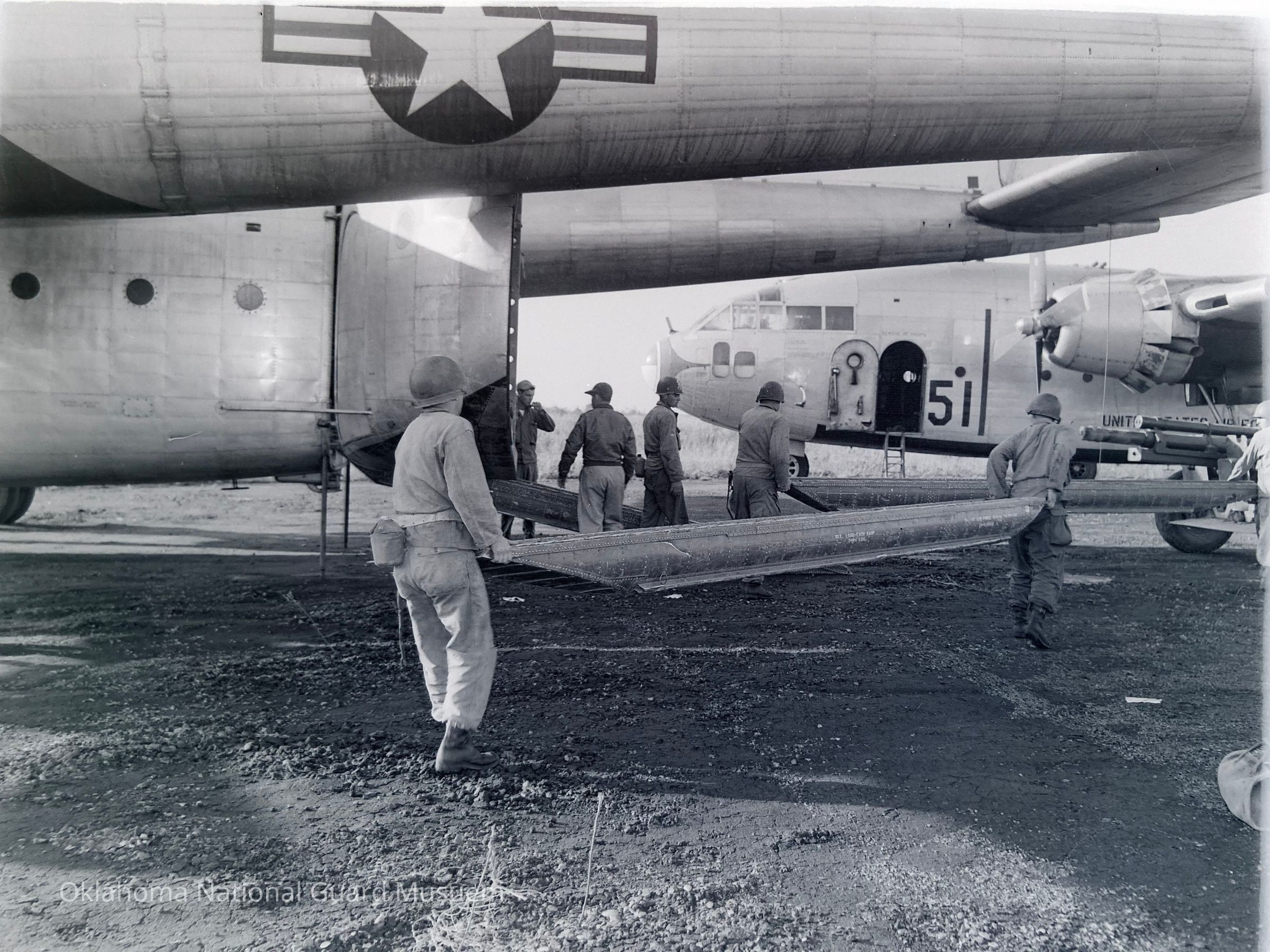 Negative of soldiers connecting cargo ramps to a C-119 aircraft