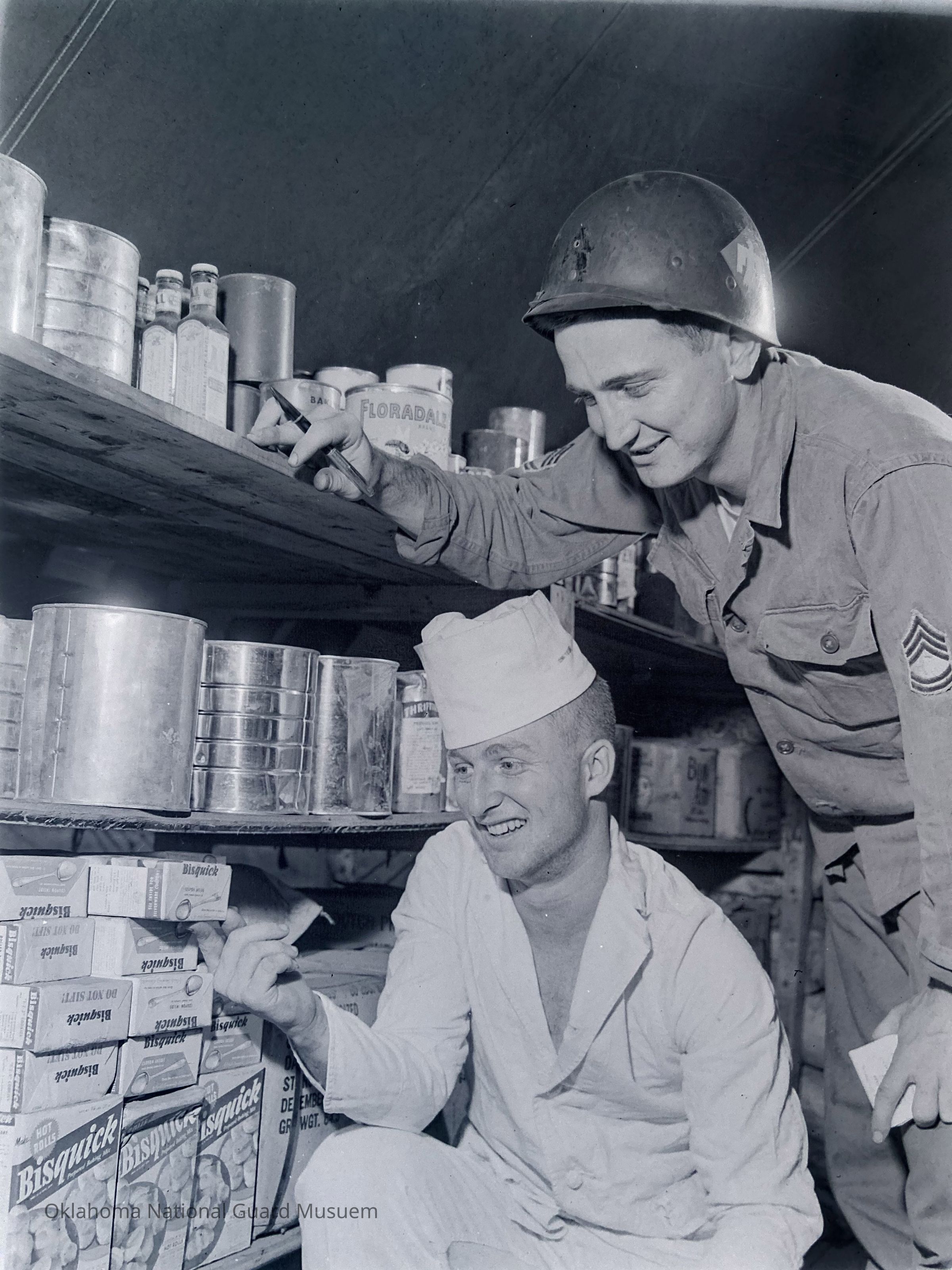 Negative of a cook and a soldier looking over the food pantry on Hokkaido, Japan