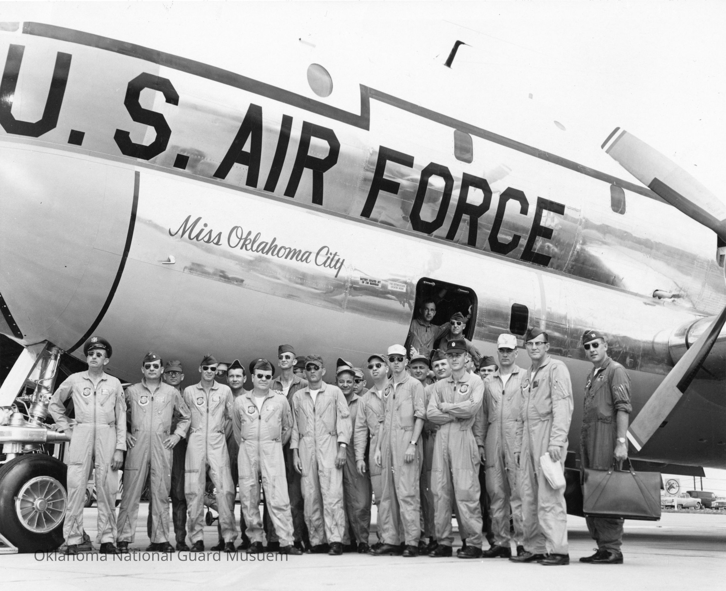 This black and white image shows a group of pilots and crew members posing in front of a U.S. Air Force airplane, labeled "Miss Oklahoma City."