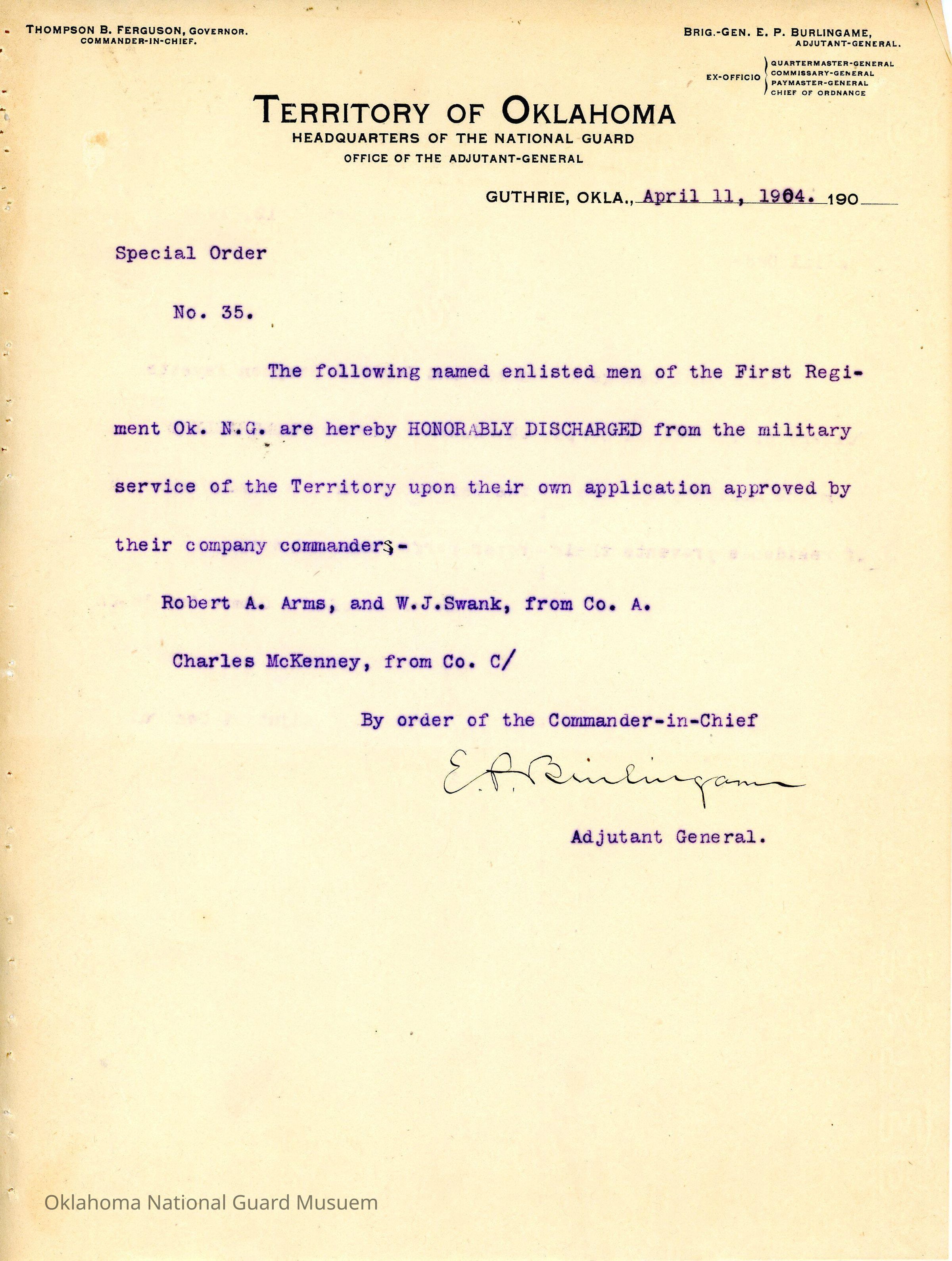 Adjutant General, Guthrie, E.P. Burlingame, Thompson B. Ferguson, First Regiment, Honorable discharges, Robert A. Arms, W.J. Swank, Charles McKenney