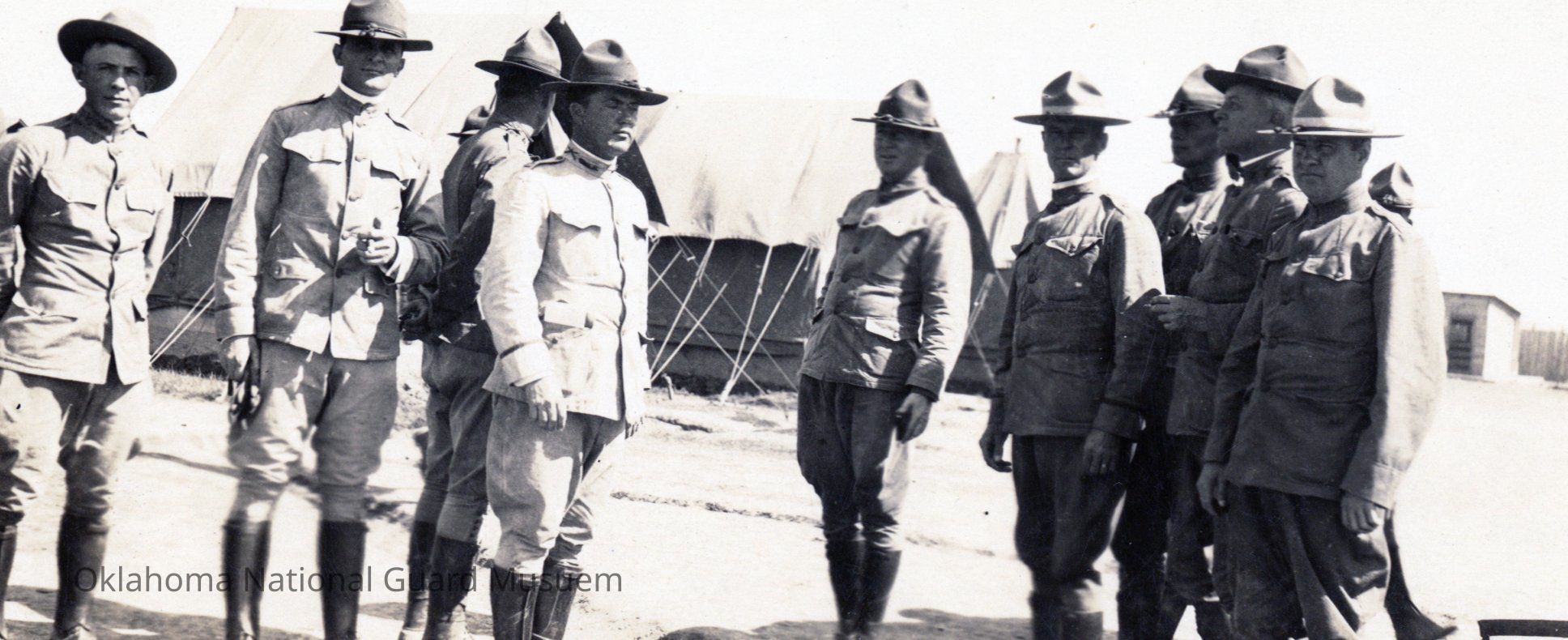 Officers of First Oklahoma Infantry gather for a meeting (Left to Right) Matheney Company B Coombs Company B Merryfield Supply Company Hammer Company L James Berry Company L Gobin Regiment Adjutant Jayne Mitchell N Company Green 2nd Battalion Steve Grahm