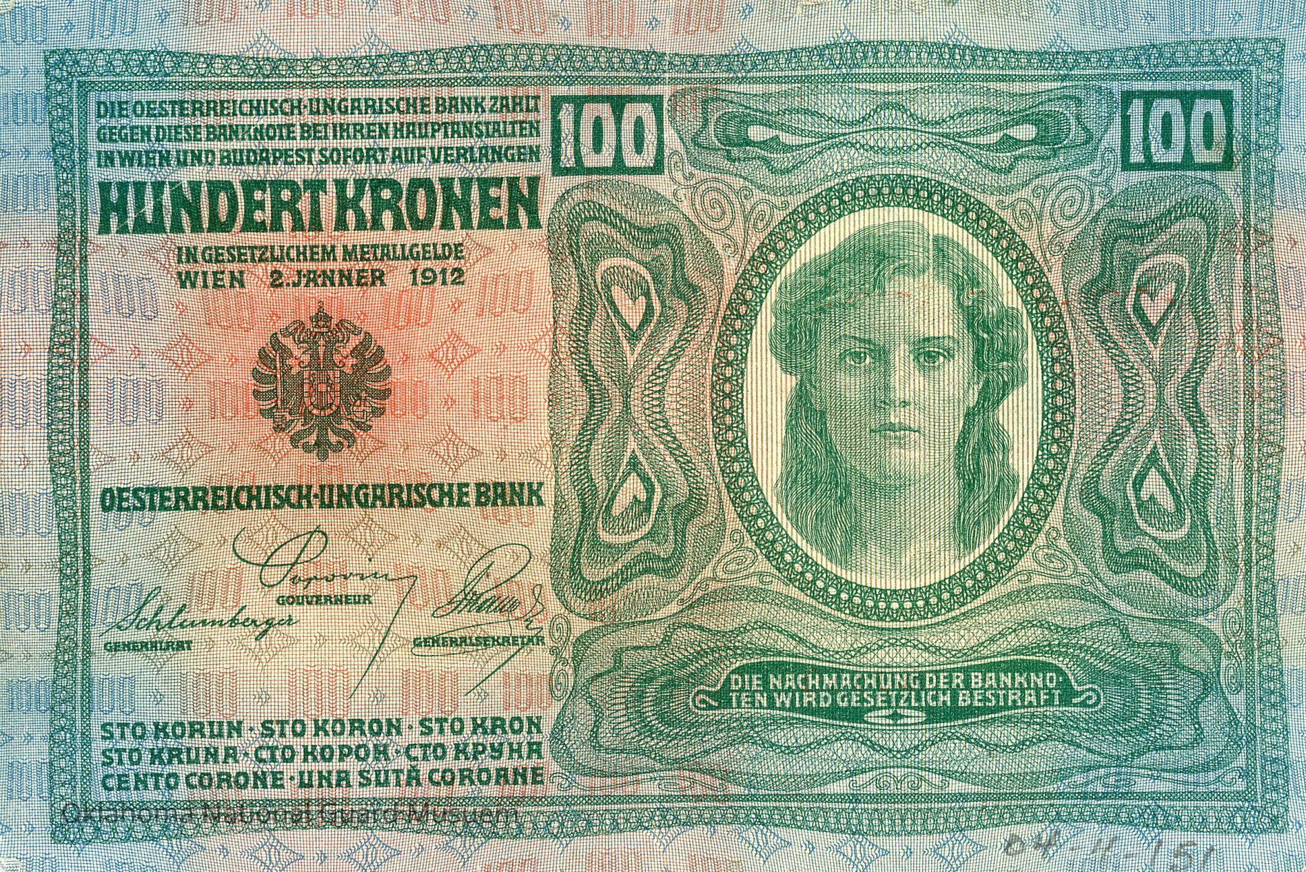 Austrian One Hundred Kronen Overprint. Dated January 2, 1912, but the overprint in red on the obverse indicates a later re-issue in 1919. Accession number written on the reverse at the bottom.