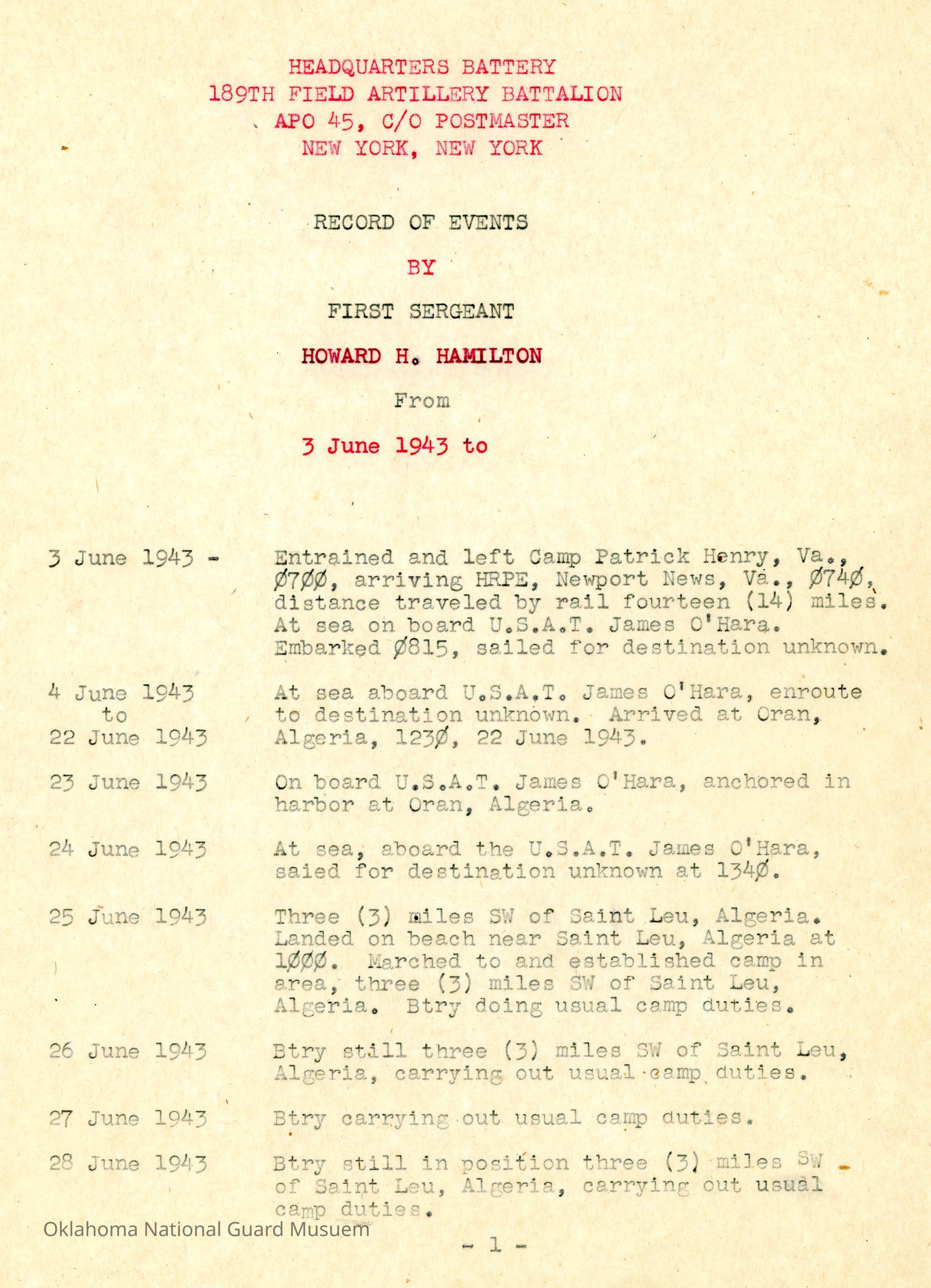 Daily record of events of Headquarters Battery 189th Field Artillery written by Howard H. HamiltonContext