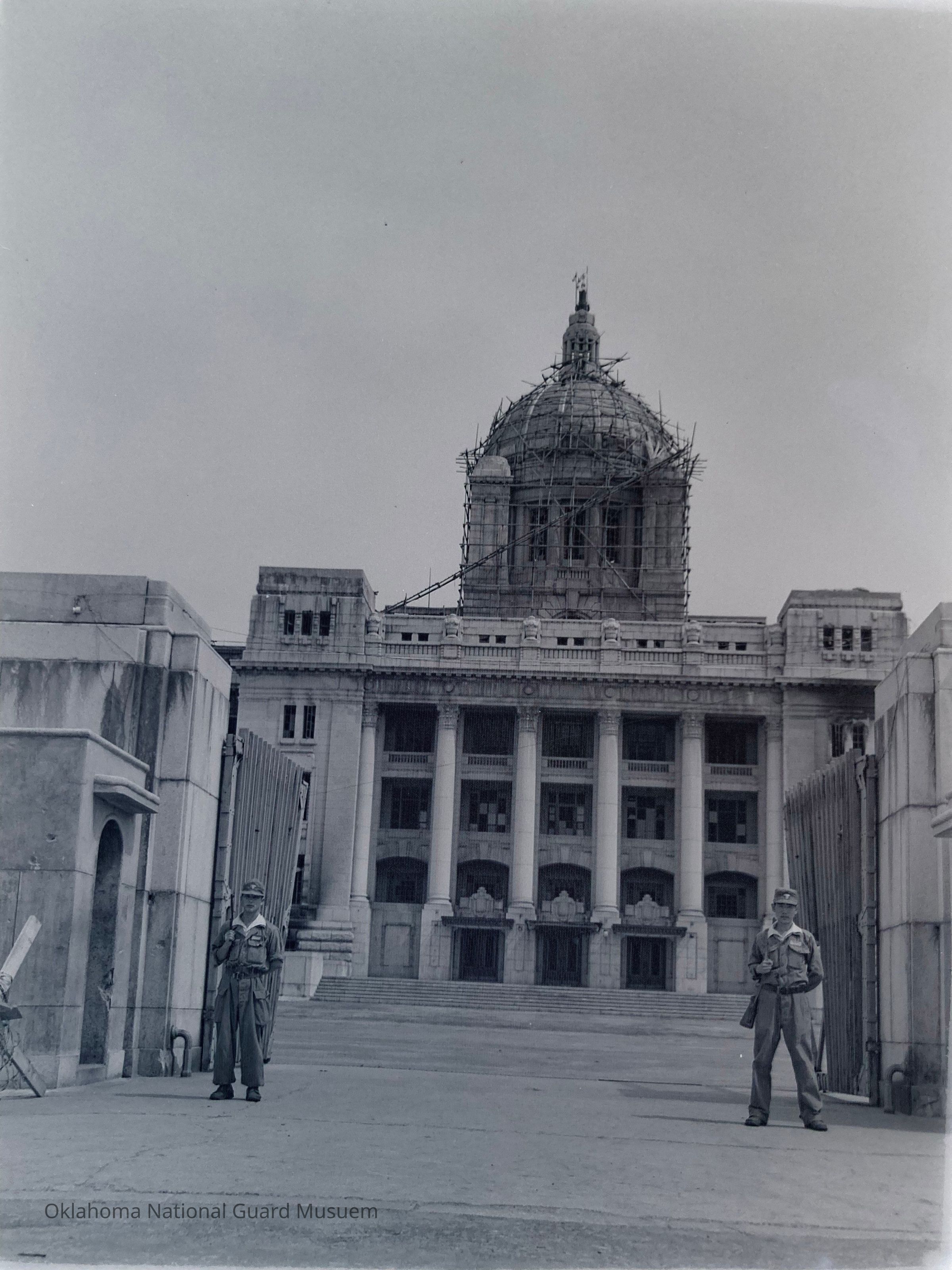 Damaged government building guarded by soldiers