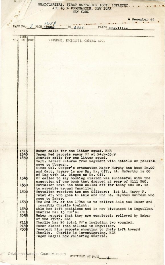 Daily journal of First Battalion 180th Infantry in December 1944. Compiled by Clyde Hoestetler- Battalion Sergeant Major