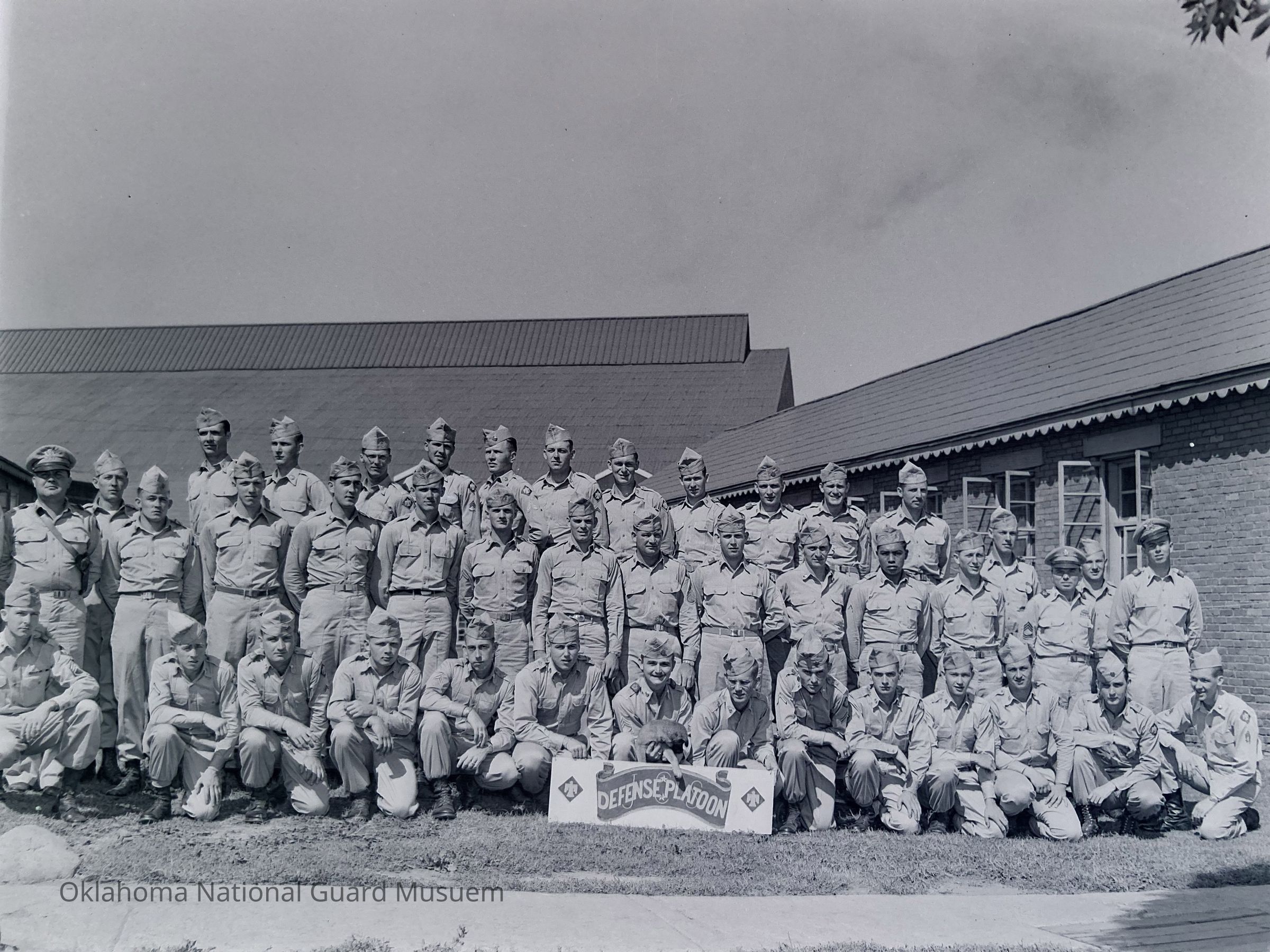 Negative of Defense Platoon photo in front of buildings on Hokkaido, Japan
