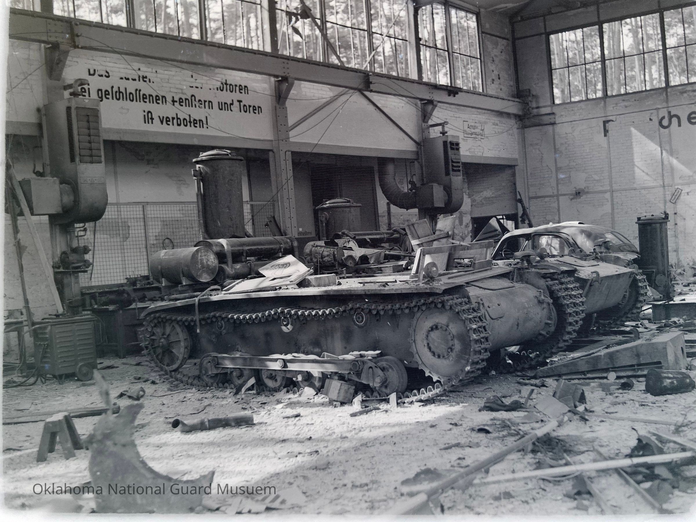 Negative of destroyed German equipment and vehicles in the ruins of a repair shop