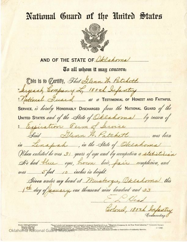 Patchett joined the Oklahoma National Guard on 1/2/1929