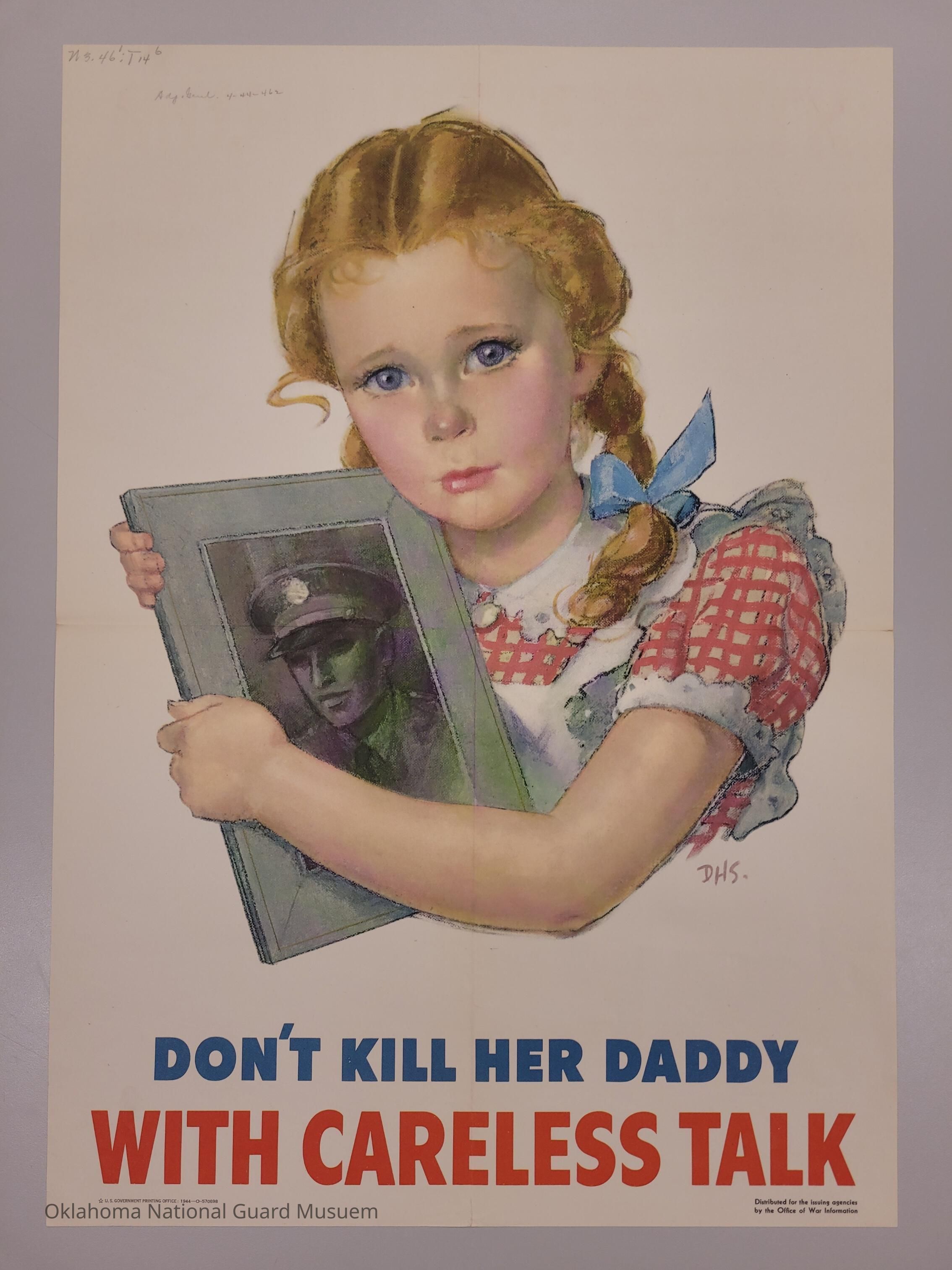 Color poster by DHS (Dorothy Hope Smith) dated 1944 showing a sad-looking young girl clutching a picture of her serviceman father, with the text positioned below reading "Don't kill her daddy with careless talk."Collection