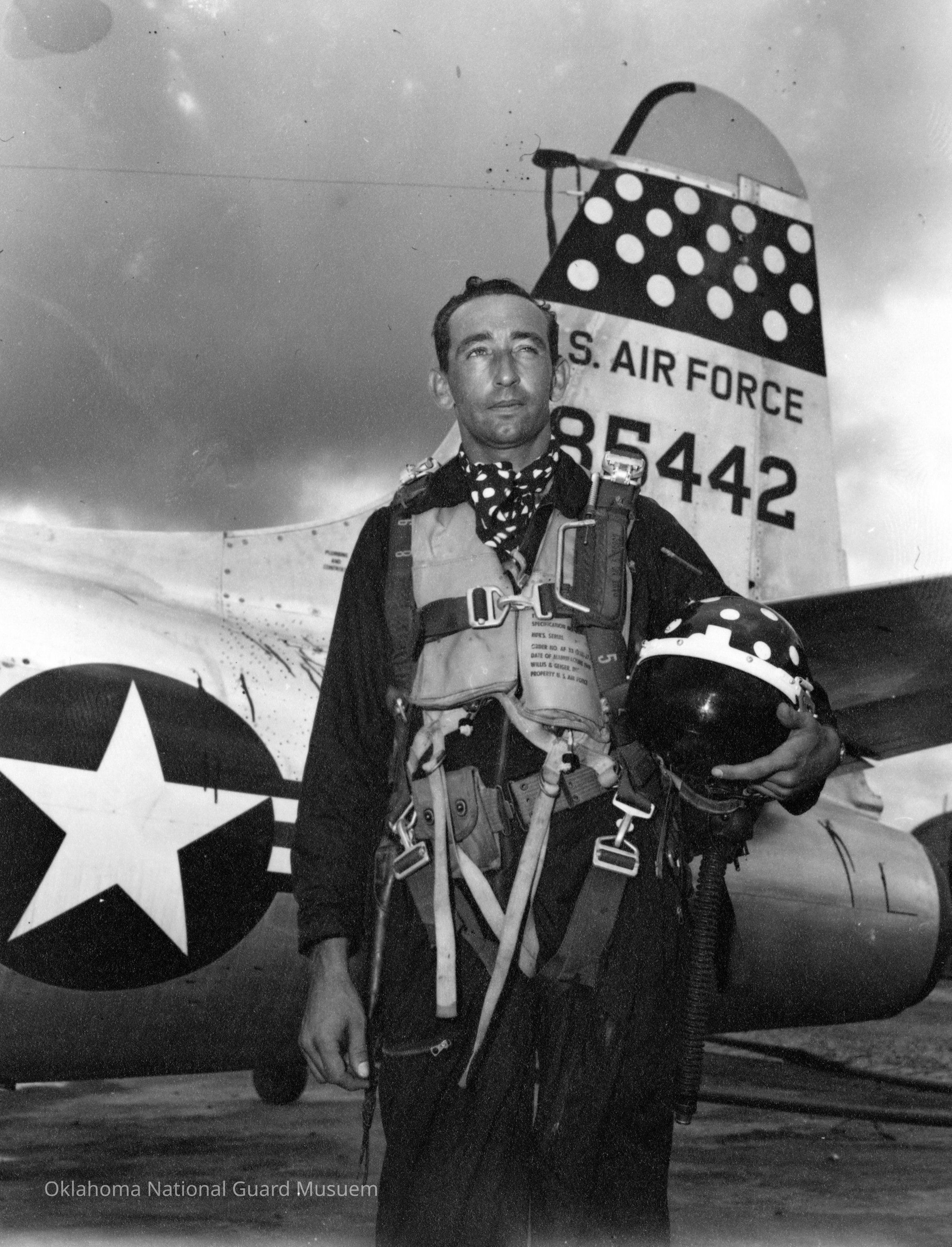 Doyle Hastie posed in front of his aircraft with his flight helmet