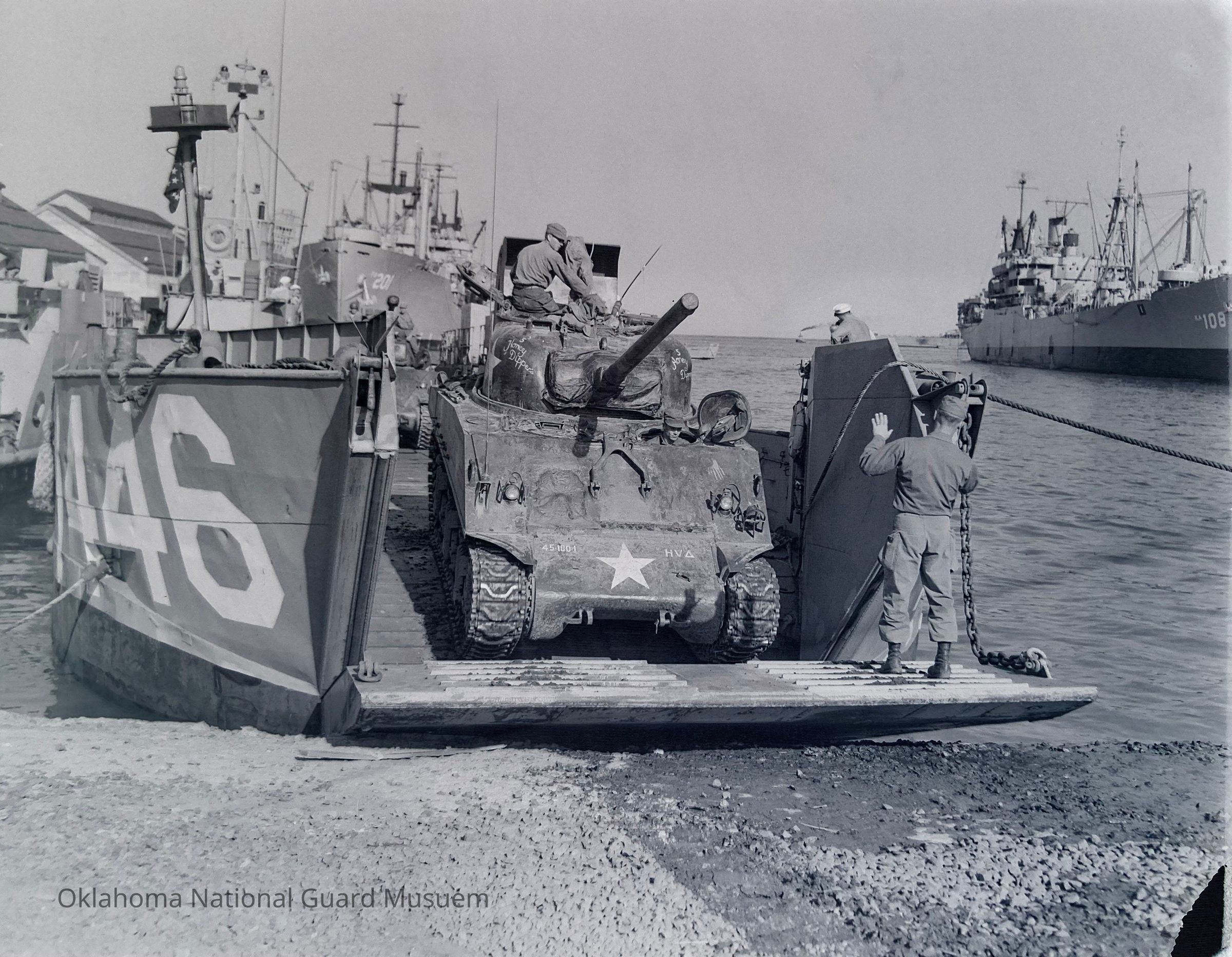 Driving a tank off of a beach landing craft
