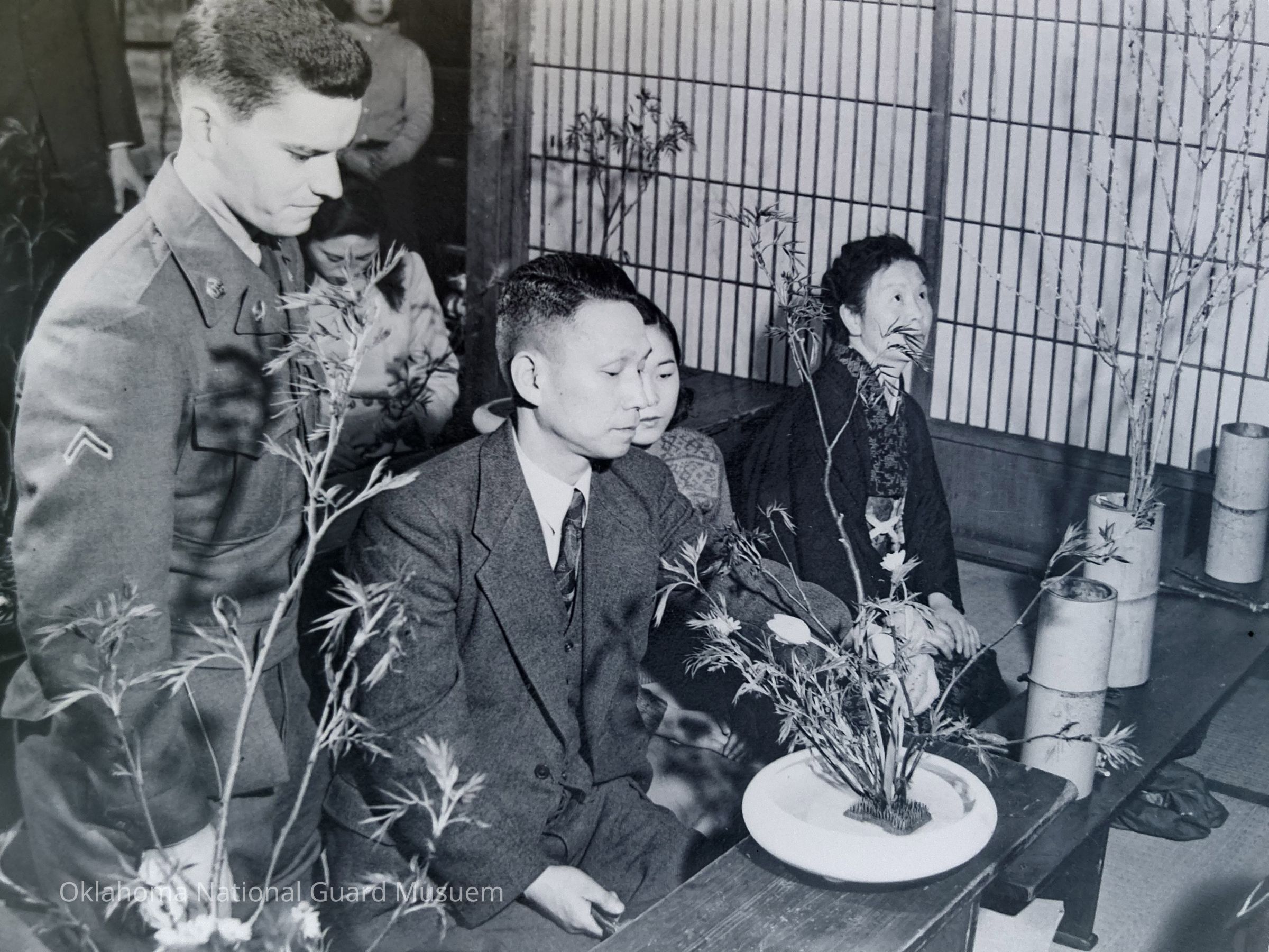 Soldier and Japanese civilians examining potted plants