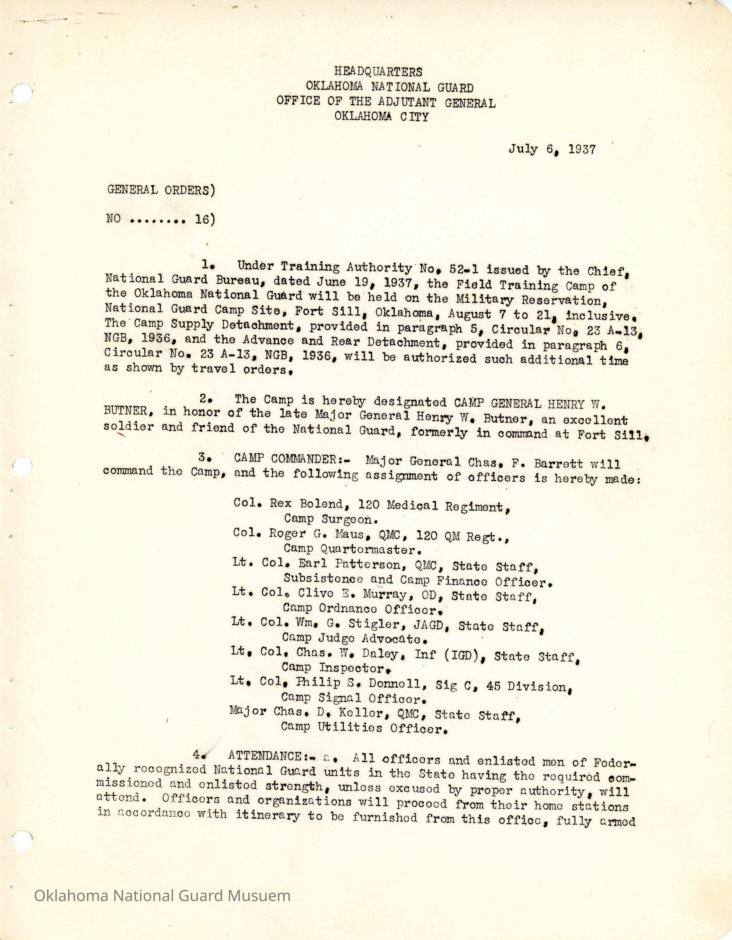 Adjutant General, Oklahoma City, Charles F. Barrett, E.W. Marland, Fort Sill, Camp General Henry W. Butner, Henry W. Butner, Annual Encampment, Rex Bolend, 120th Medical Regiment, Roger G. Maus, 120th Quartermaster Regiment, Earl Patterson, Clive E. Murray, William G. Stigler, Charles W. Daley, Phillip S. Donnell, 45th Signal Company, Charles D. Keller, Attendance, Transportation, Camp Supply Detachment, Advance Detachment, Rear Detachment, 90th Infantry Brigade, 70th Field Artillery Brigade, 179th Infantry, 180th Infantry, 158th Field Artillery, 160th Field Artillery, 189th Field Artillery, 120th Medical Regiment, 120th Engineers, Subsistence, Rations, Pay
