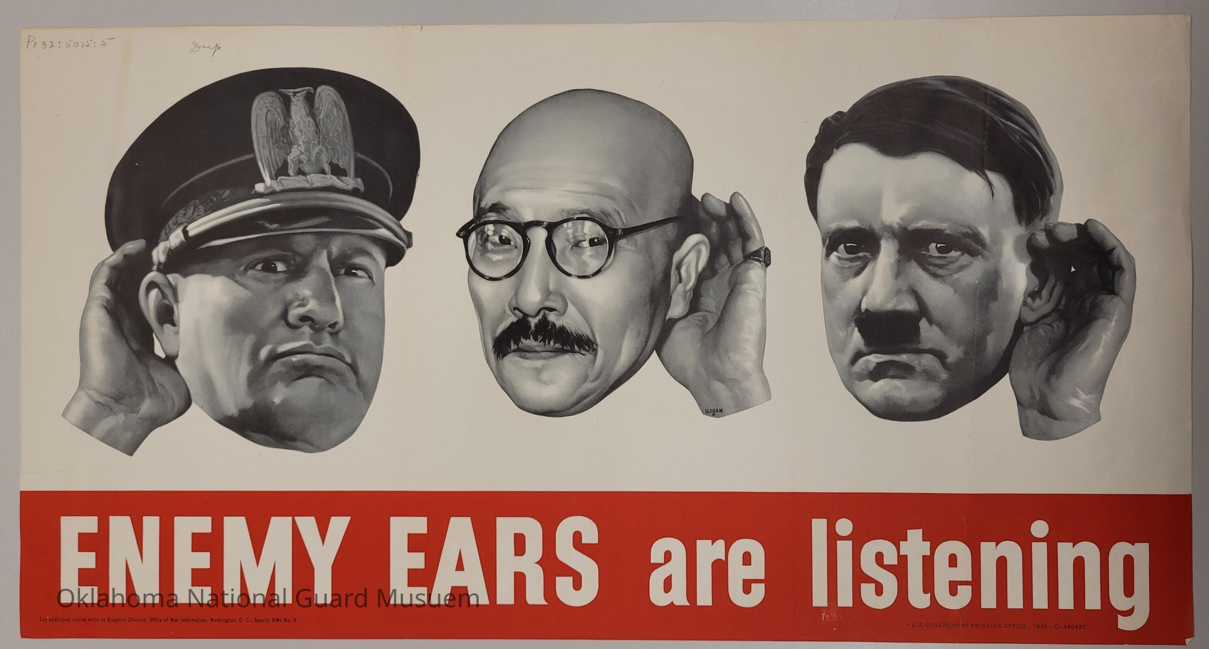 The poster depicts Benito Mussolini, Hideki Tojo, and Adolf Hitler. Only one hand and the head of each man is shown. Each has his hand cupped around one ear. On Tojo's hand is a pinky ring and the artist's signature "Iligan" is written on his wrist, with a small inverted black triangle symbol below it.Collection
